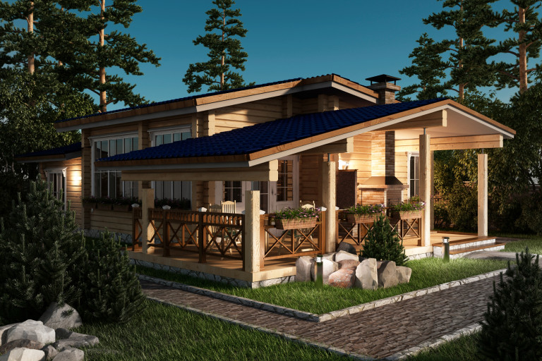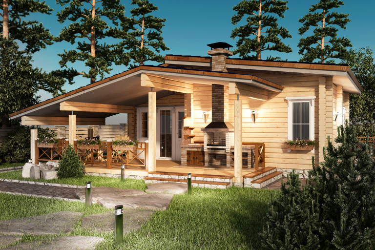 Проект «norvex» - многофункциональное дополнение к вашей усадьбе, помимо банного комплекса выполняет функцию домика для гостей, а терраса оснащена печью для барбекю. Комфорт зимой и летом!