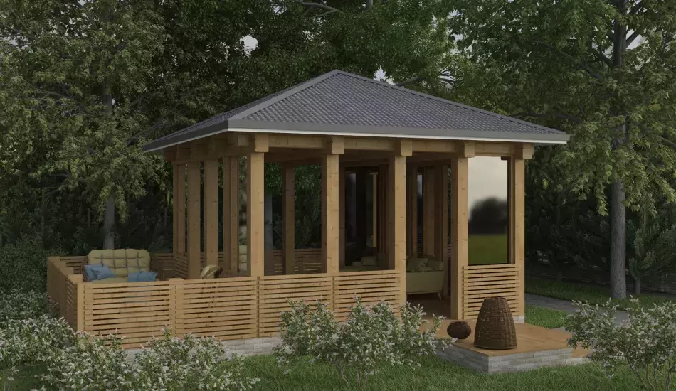 Беседка из клееного бруса — надежная конструкция и комфортное место для уютных посиделок. В беседке вы легко укроетесь от дождя и ветра, и ваш вечер не будет испорчен внезапной непогодой. Обустроить беседку из клееного бруса на вашем участке помогут опытные мастера компании «Диво».