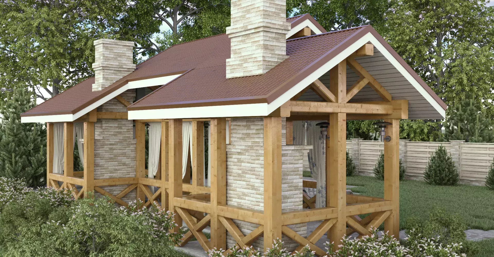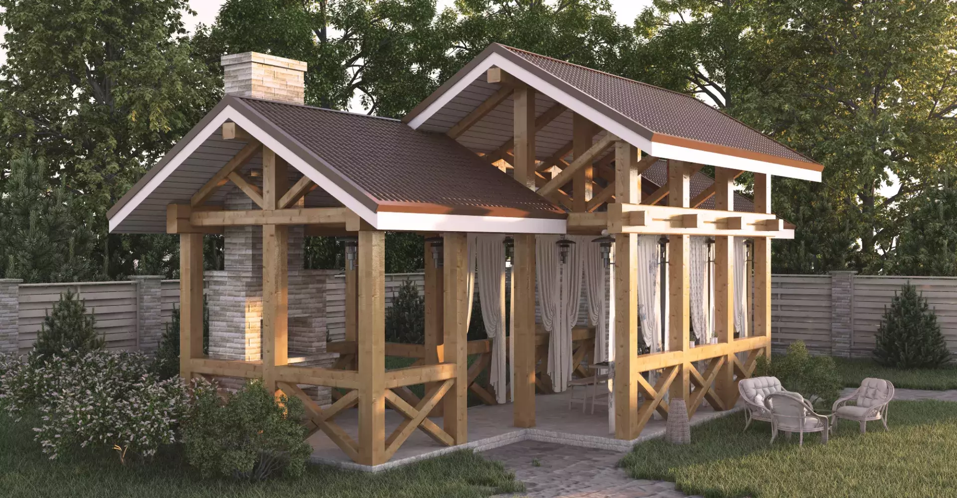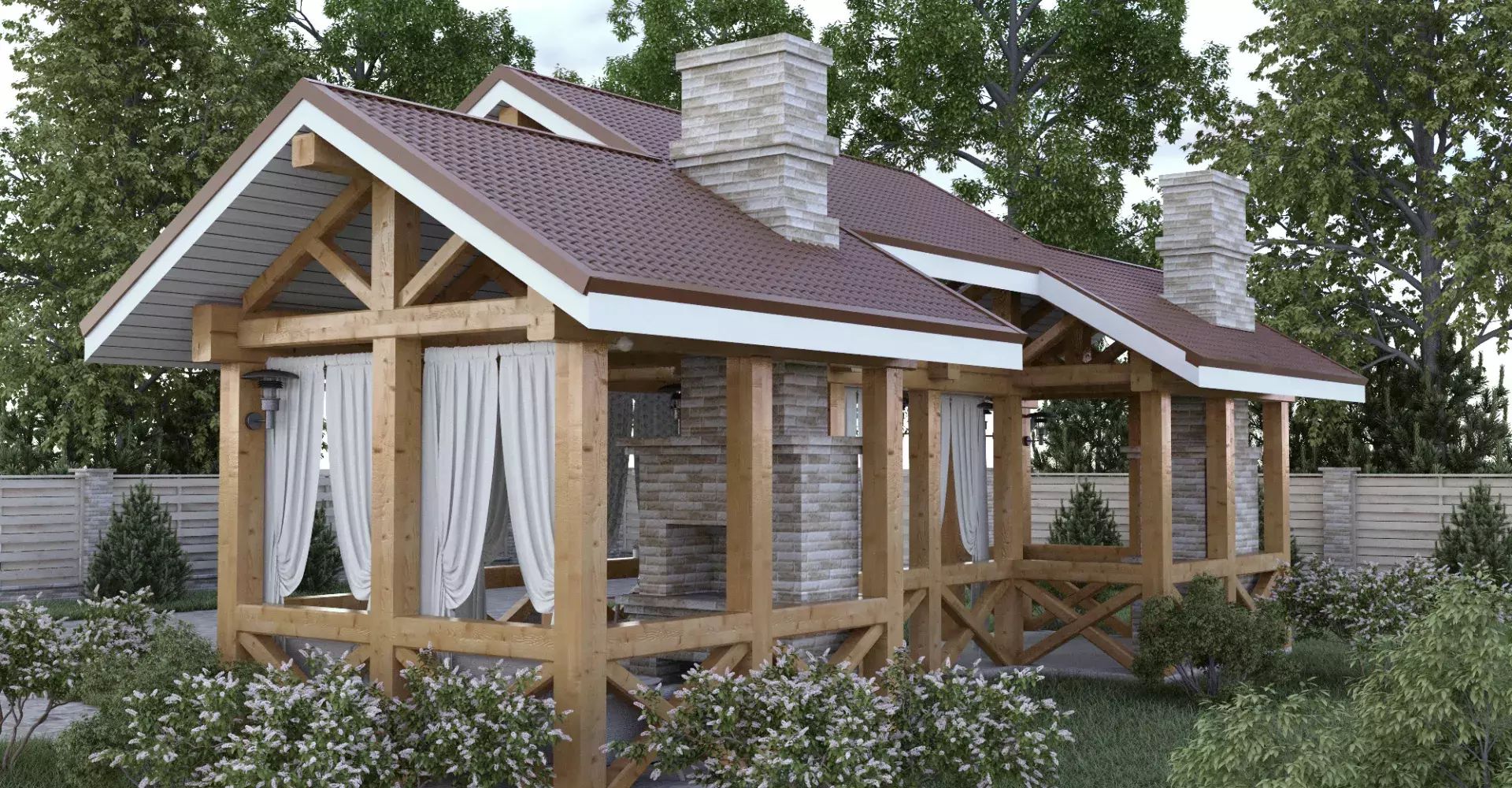 Изящная и легкая летняя кухня украсит любой участок. Благодаря зонированию она удобна для отдыха компанией, где каждый найдет себе комфортное место.