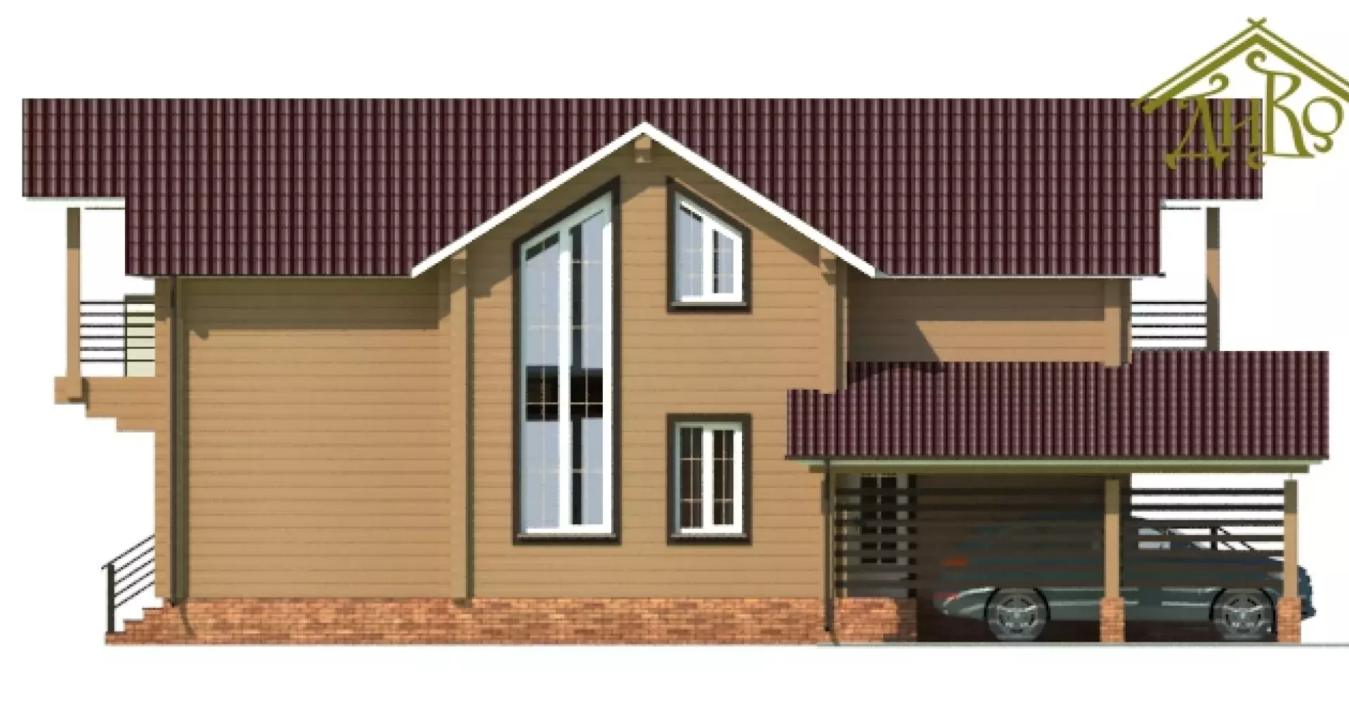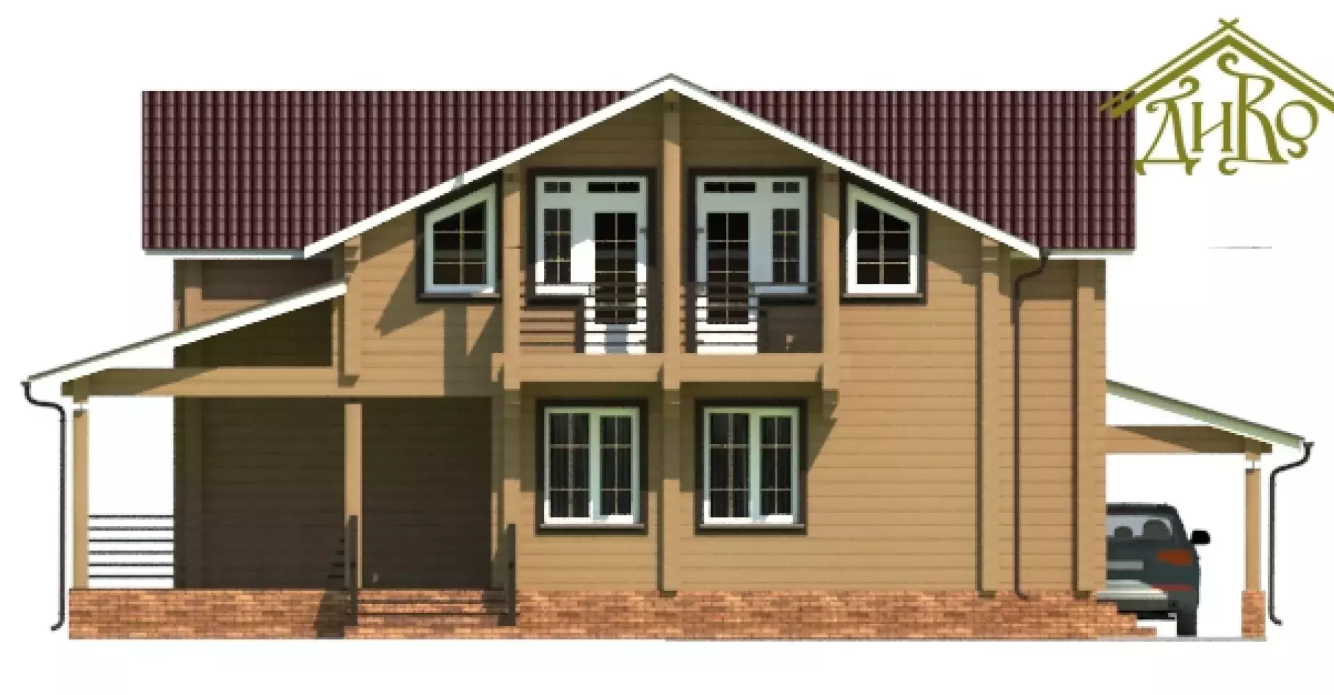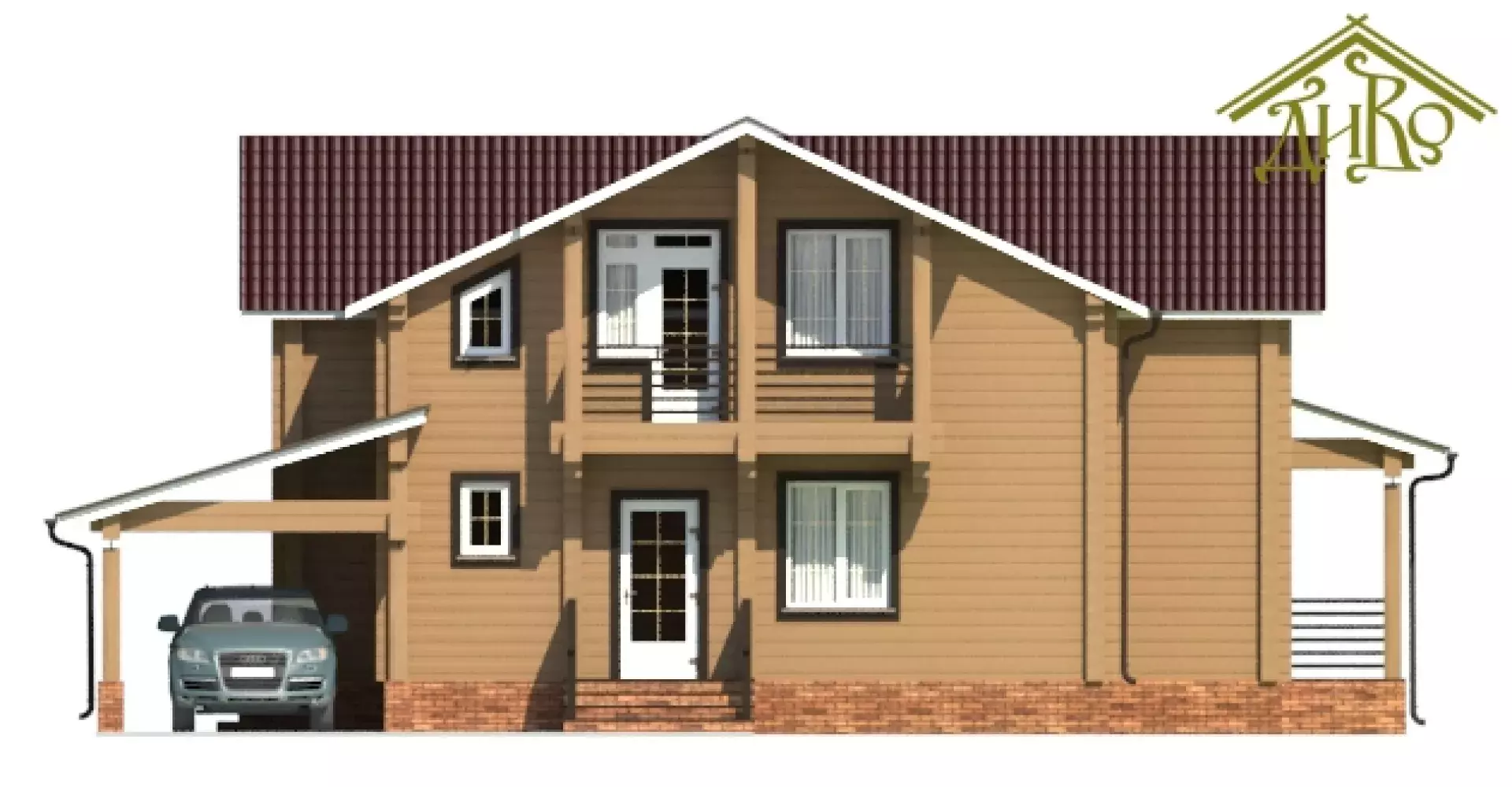 Деревянный дом в полтора этажа площадью 245 м2 с автонавесом и вторым светом — прекрасный выбор для проживания за городом. Планировка в европейском стиле — это просторные функциональные комнаты, много света, сочетание простоты и комфорта.