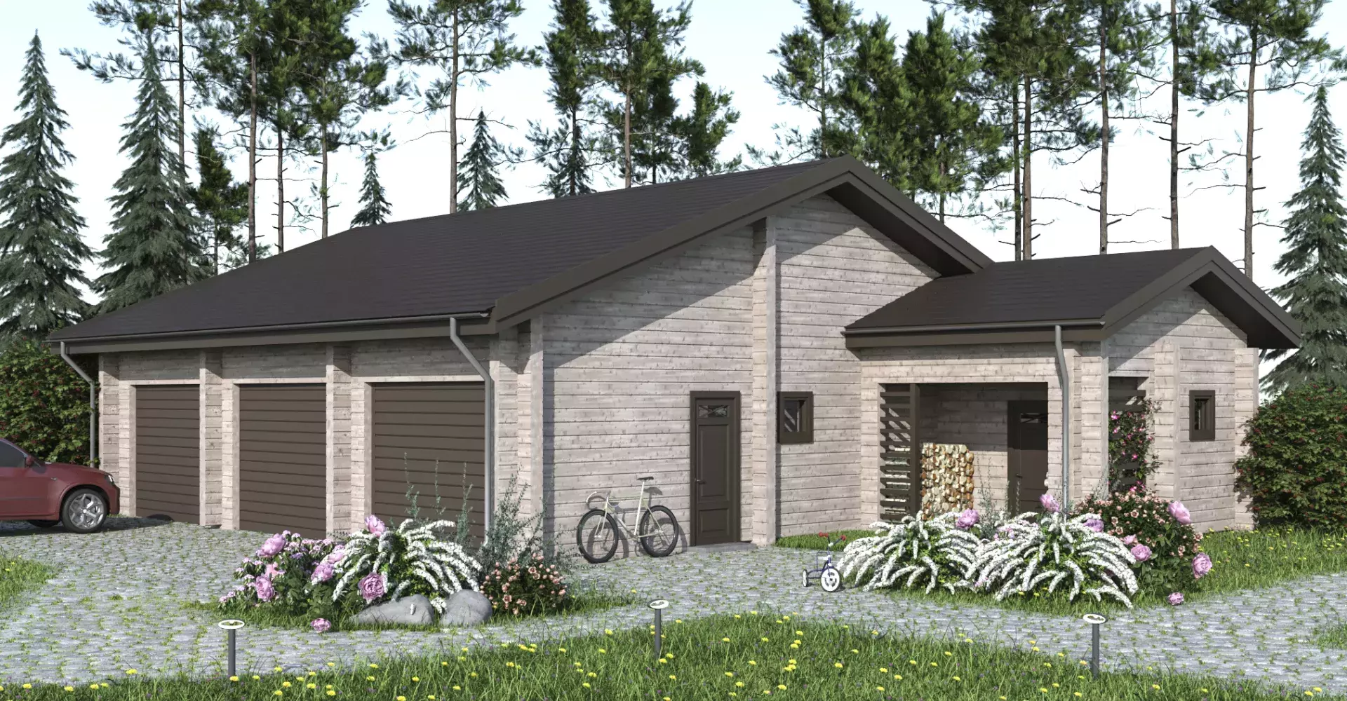 Вместительный гараж с хозяйственным блоком и поленницей, рассчитан на 3 места. Так же площадь гаража позволяет разместить какие либо мастерские или места для хранения.