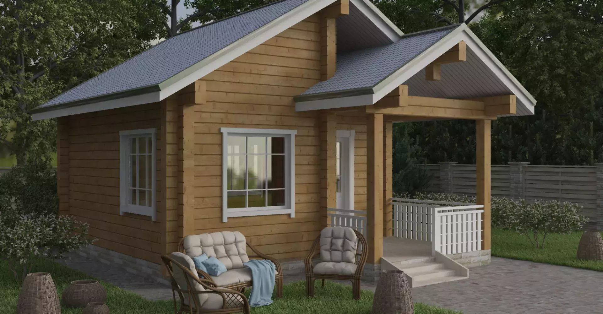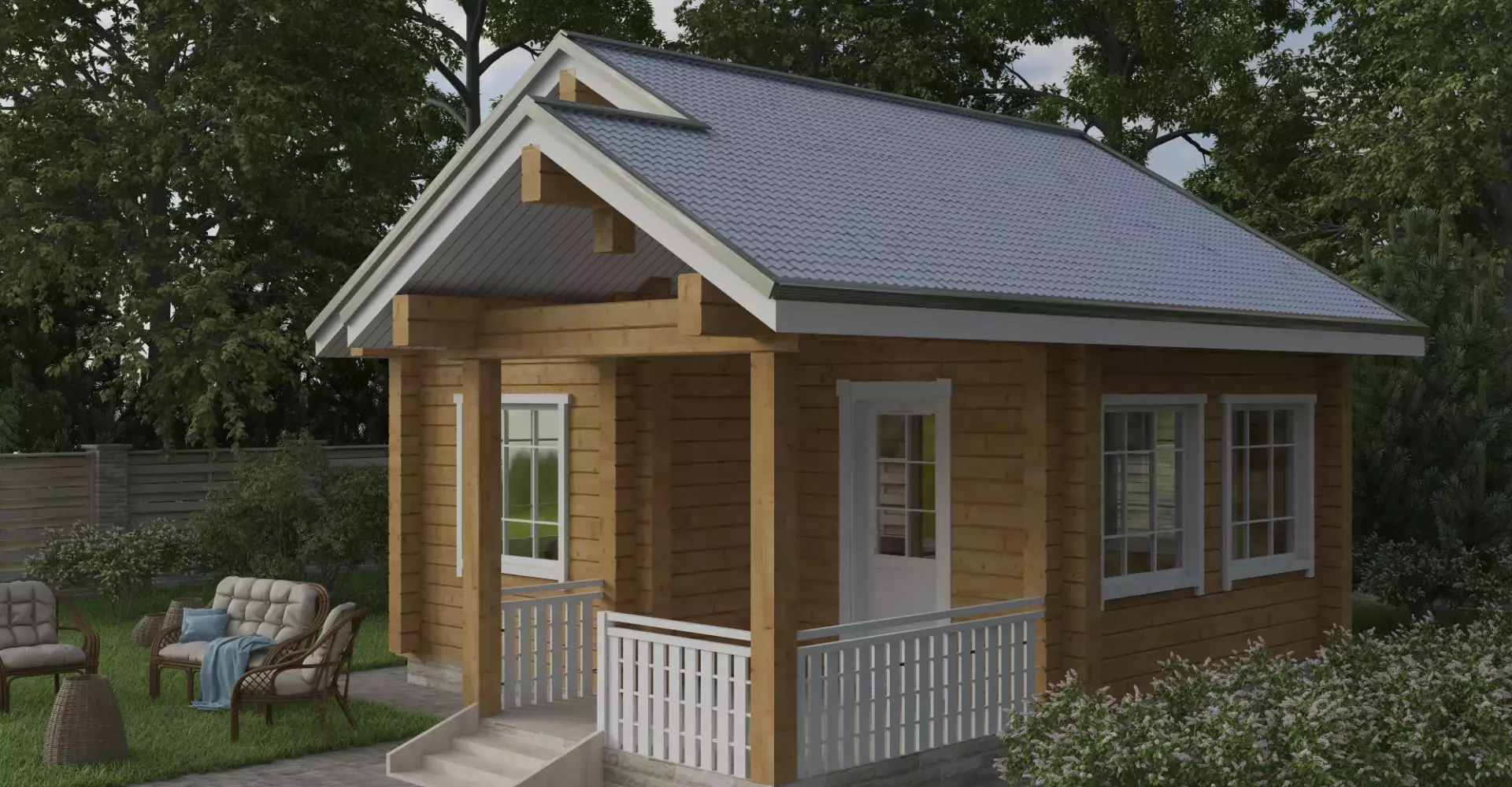 В проекте этой летней кухни предусмотрены кухня, гостиная, санузел и небольшая терраса. Может выполнять функцию гостевого домика.