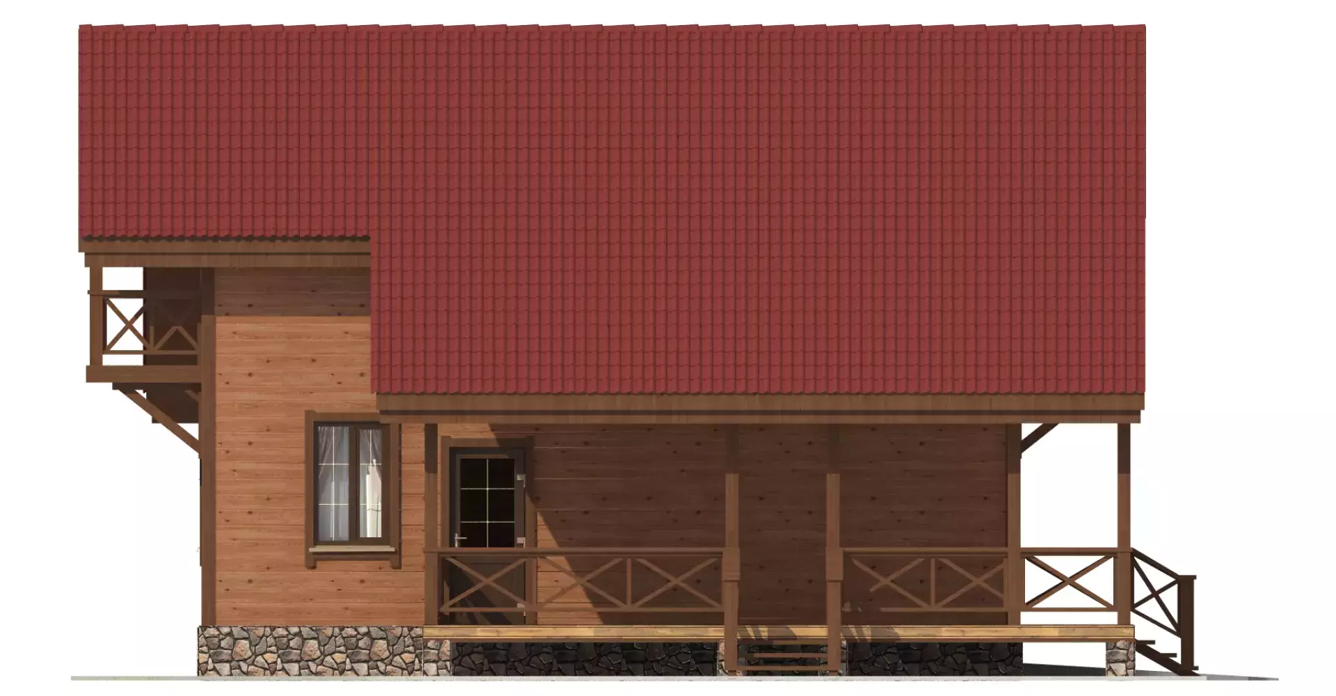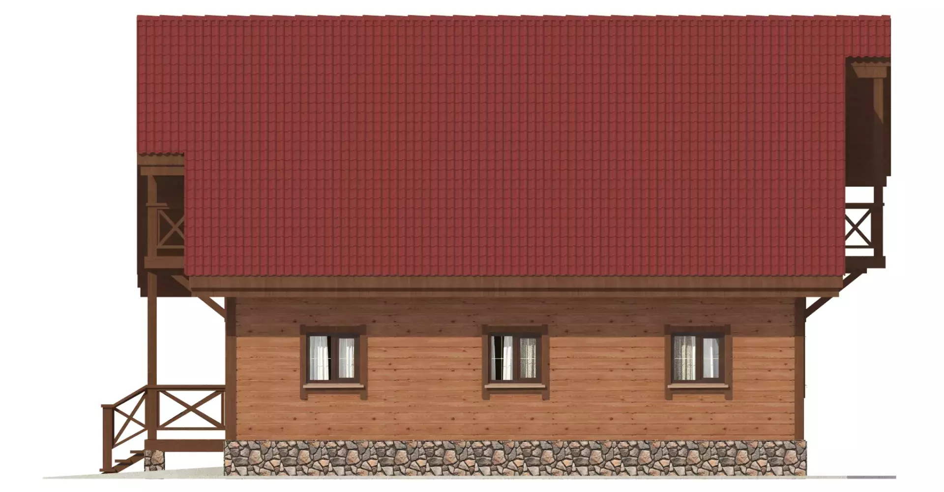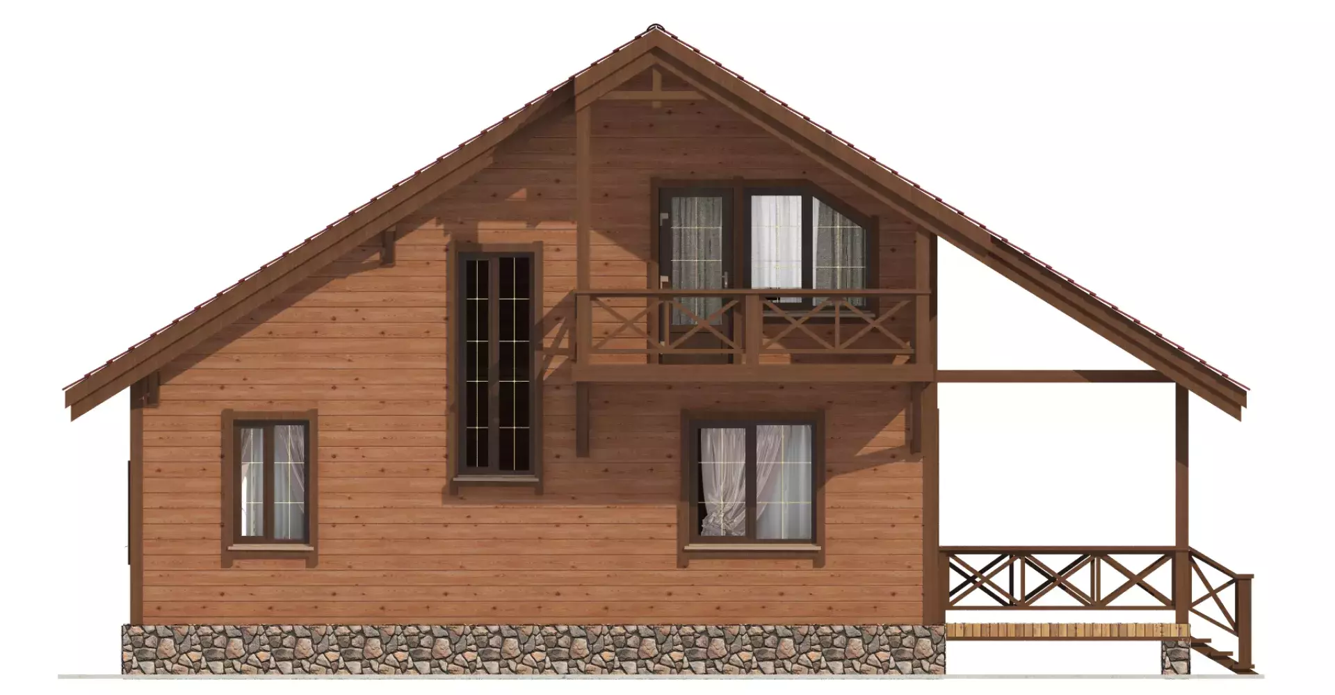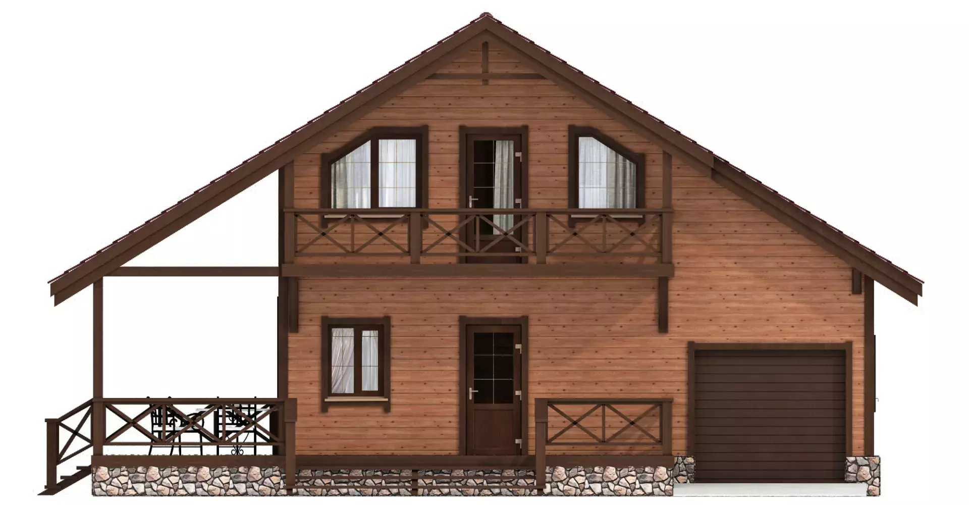 Отличное проектное решение каркасного дома для небольшой семьи. На двух этажах компактно и рационально расположились: теплый гараж, крытая терраса, вместительный холл, бытовые помещения и спальни, оборудованные балконами.