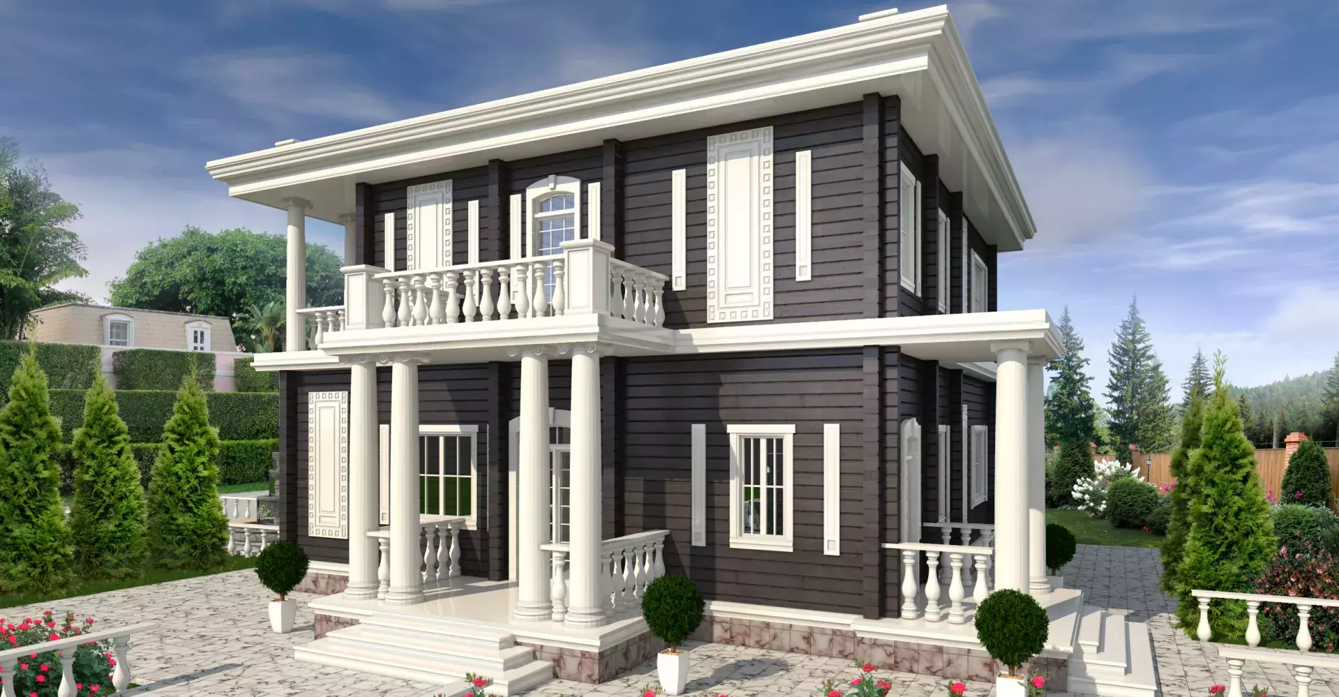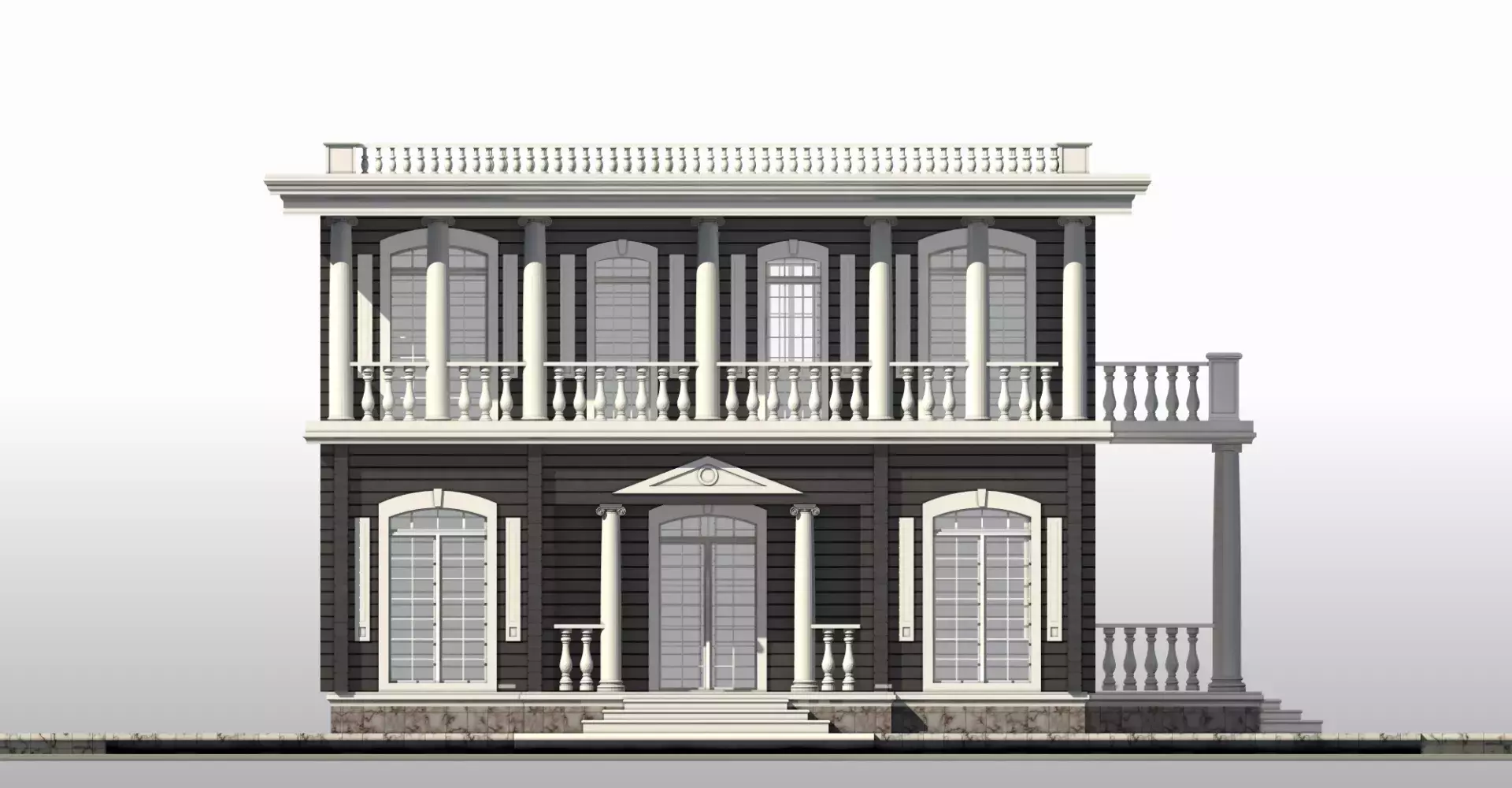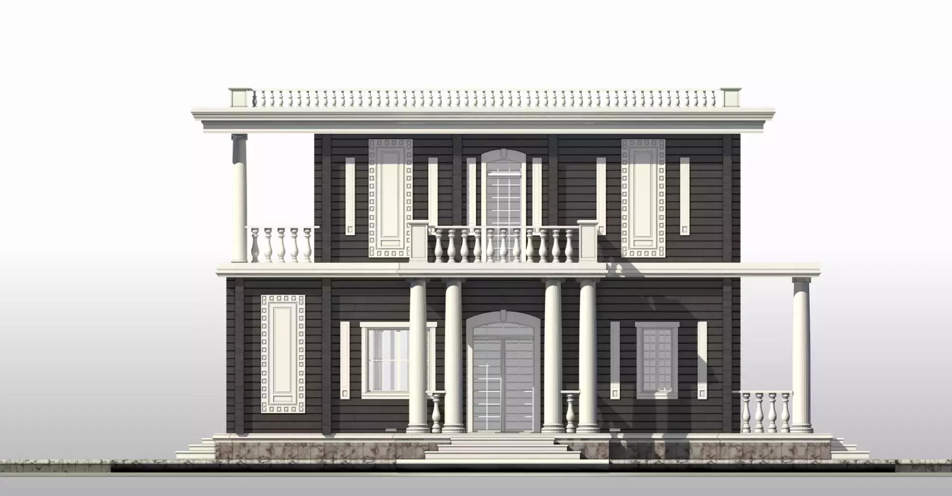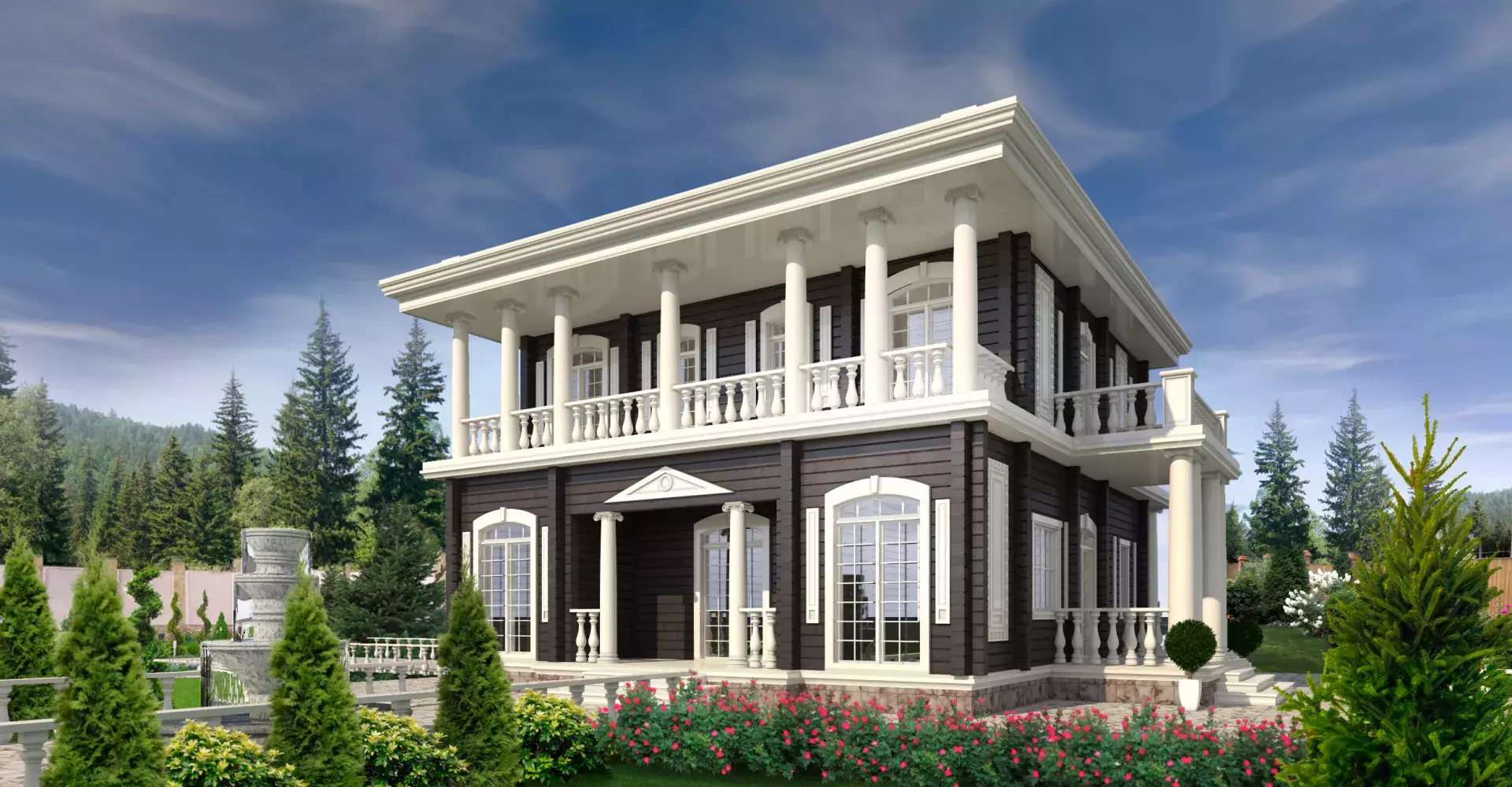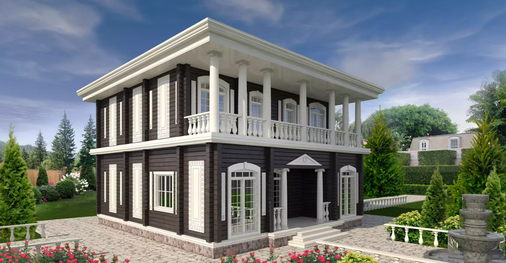 Жилой дом «Купец» - идеально подойдет для тех, кто любит производить впечатление и восхищать. Ионические колонны, балконы окруженные балюстрадами, лепнина, несомненно привлекут внимание любого гостя. Необычным решением планировки первого этажа является кухня- столовая и гостиная соединенные салоном с выходом на шикарное крыльцо внутреннего двора. Также на первом этаже расположена гостевая спальня с собственным санузлом. Второй этаж отведен для спален с выходами на шикарные балконы, а организующим является пространство холла с панорамными окнами.
