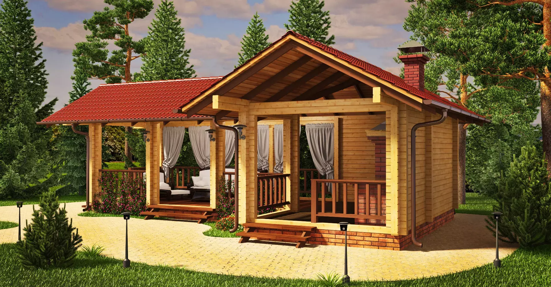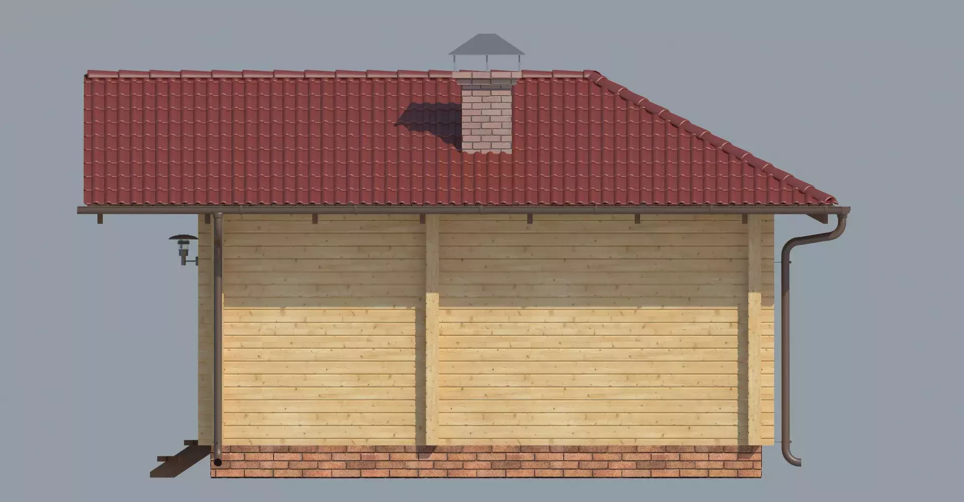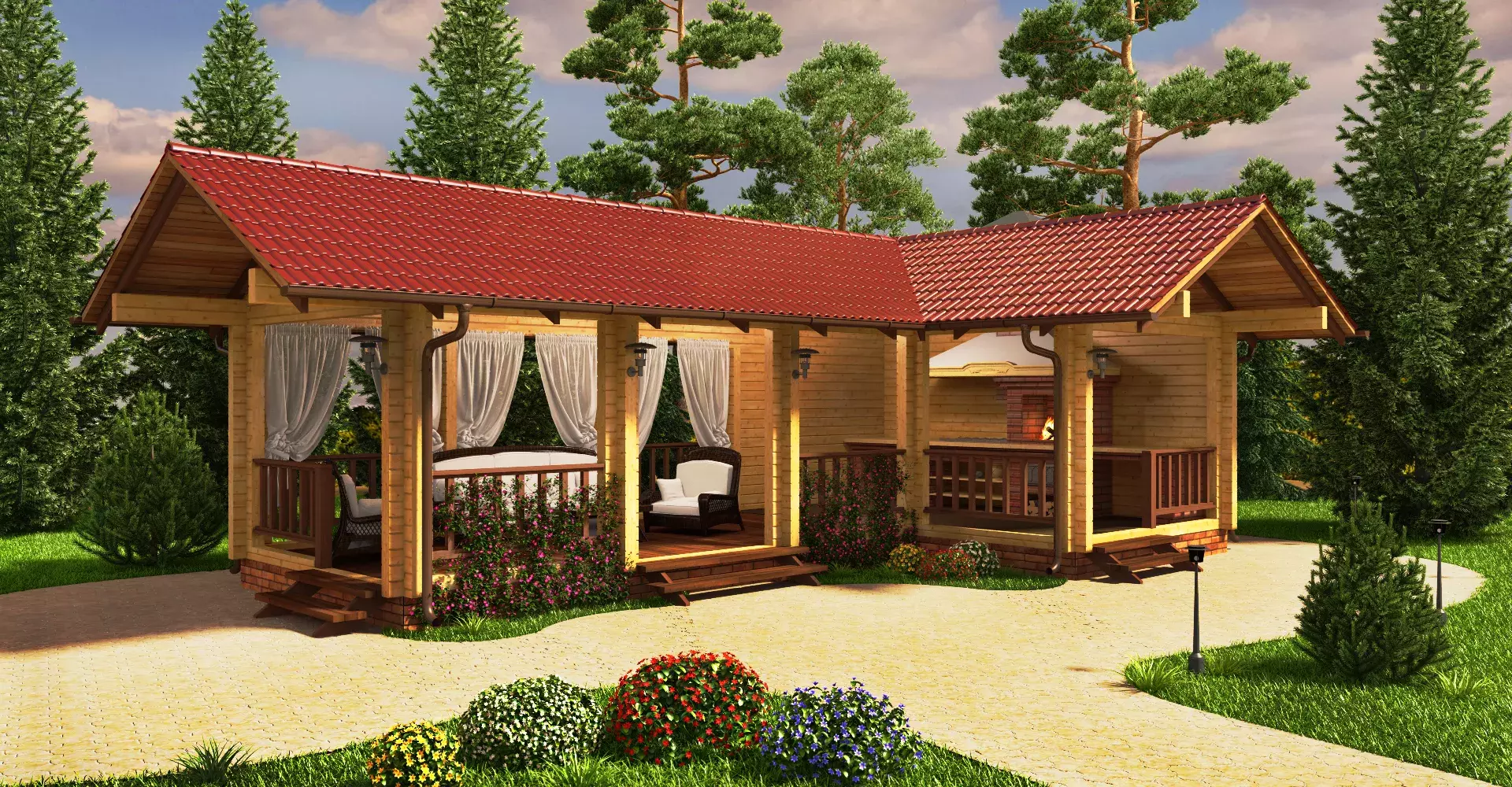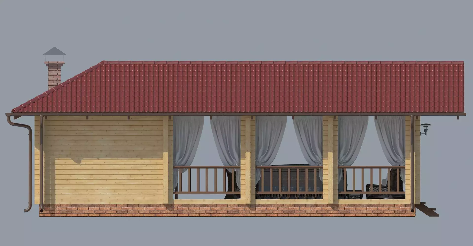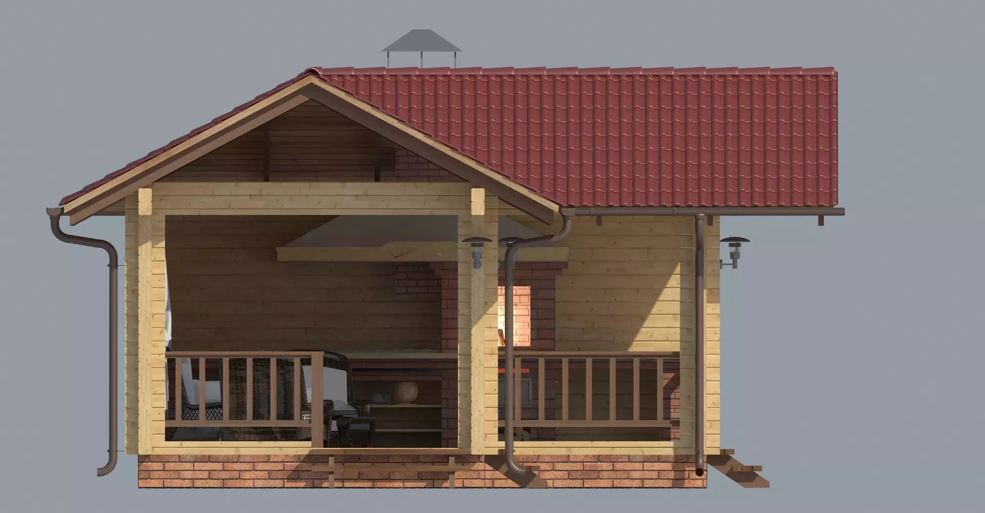 Проект летней кухни, в которой помимо зоны барбекю имеется просторная крытая терраса для отдыха большой компанией. Сохранение натурального цвета древесины в отделке фасадов позволит гармонично вписать кухню в природную среду.