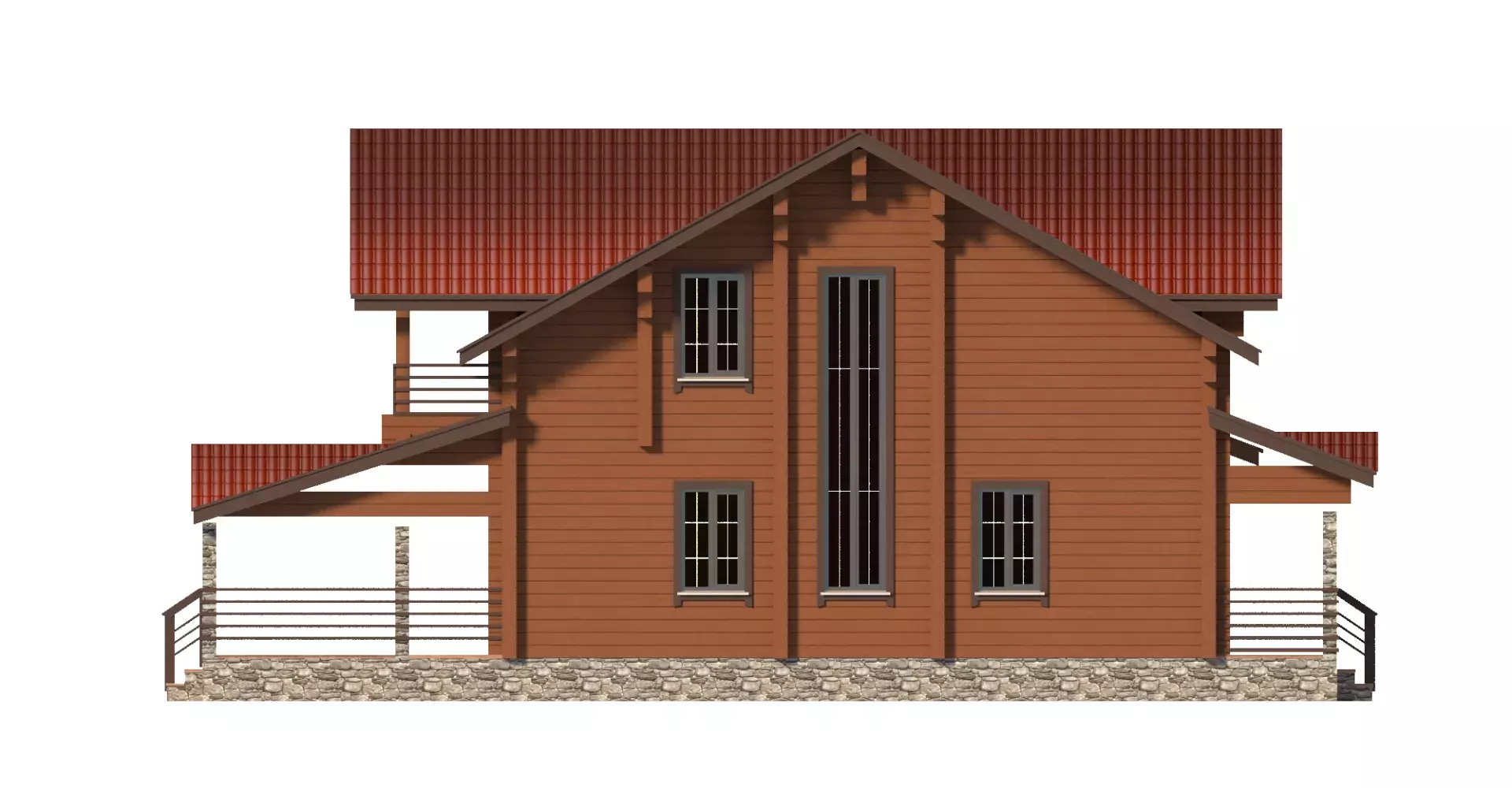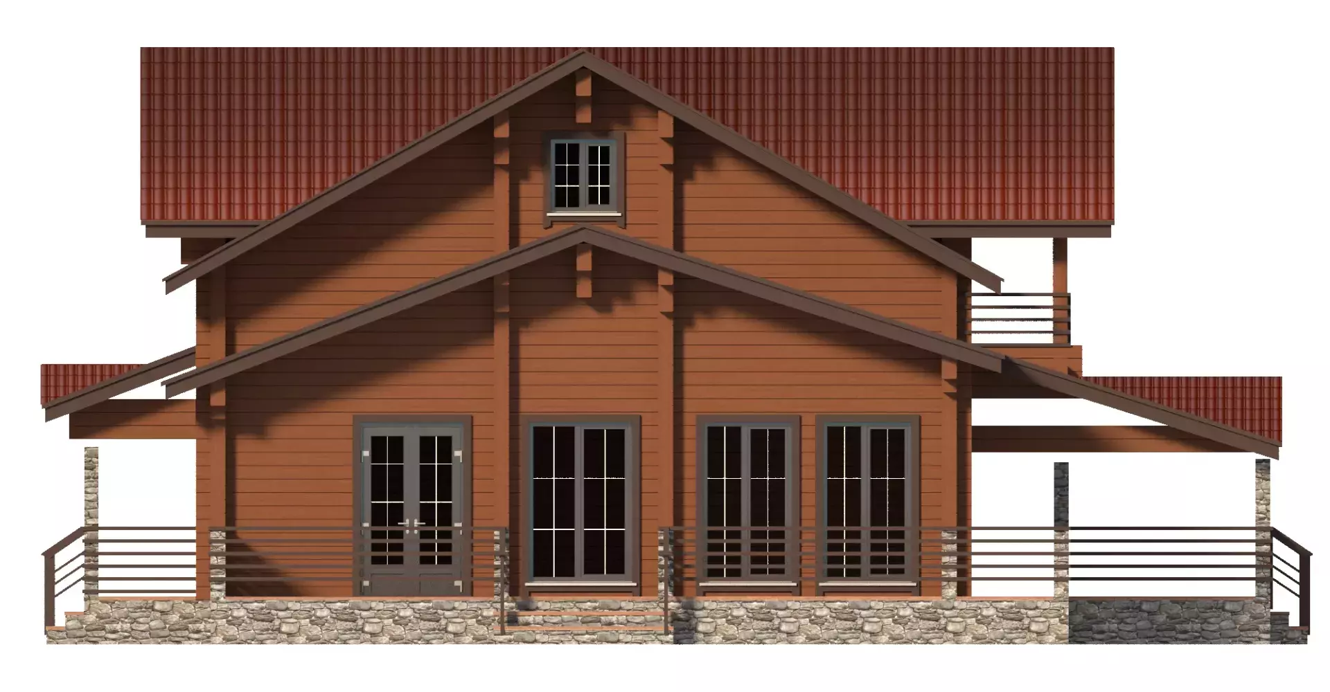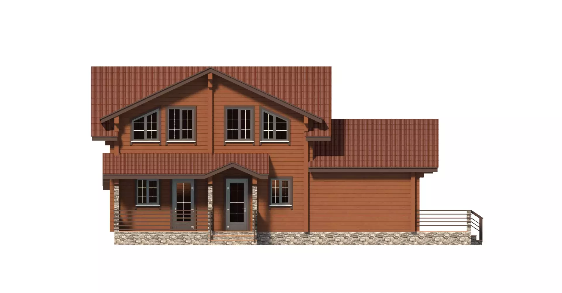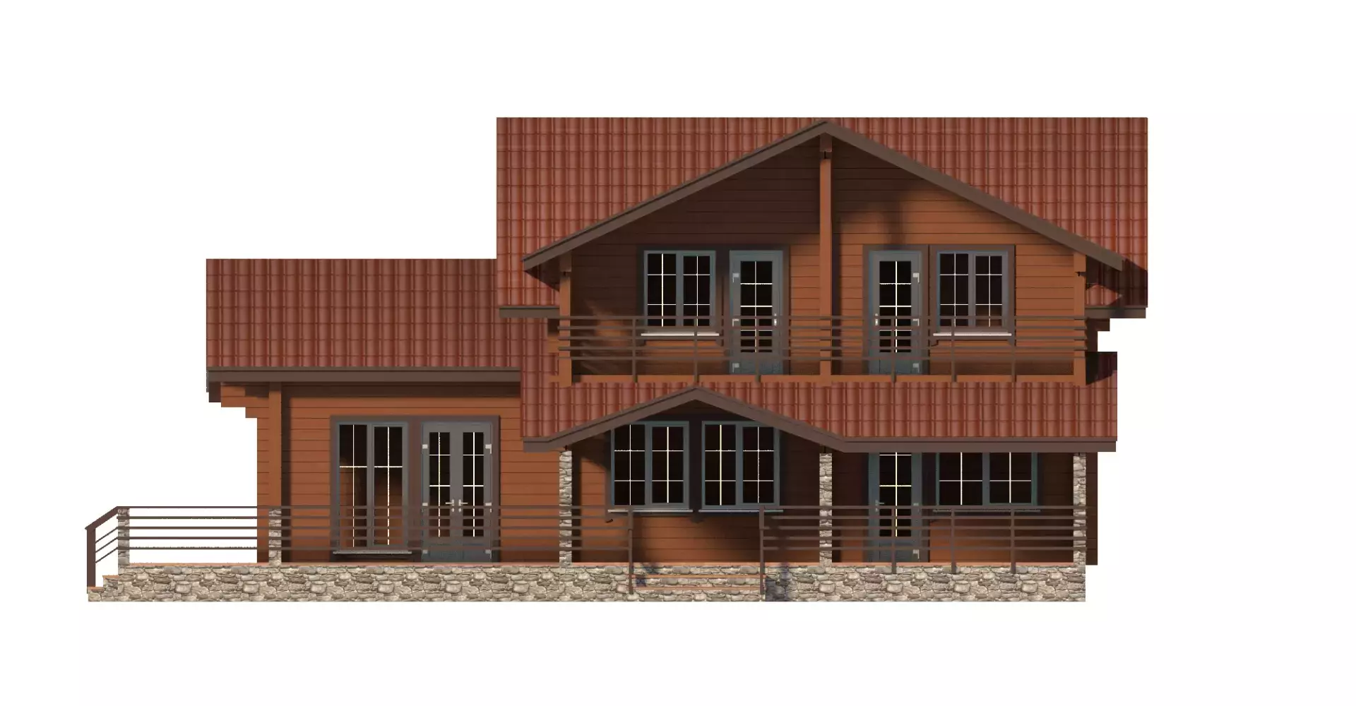 Функциональный и просторный дом из клееного бруса с четырьмя спальнями. Организация помещений  устроена таким образом, что наиболее шумные процессы располагаются в угловой части дома компактно и изолированы от основных помещений холлом. Гостиная и кухня-столовая ориентированы на террасу и имеют большую площадь остекления.