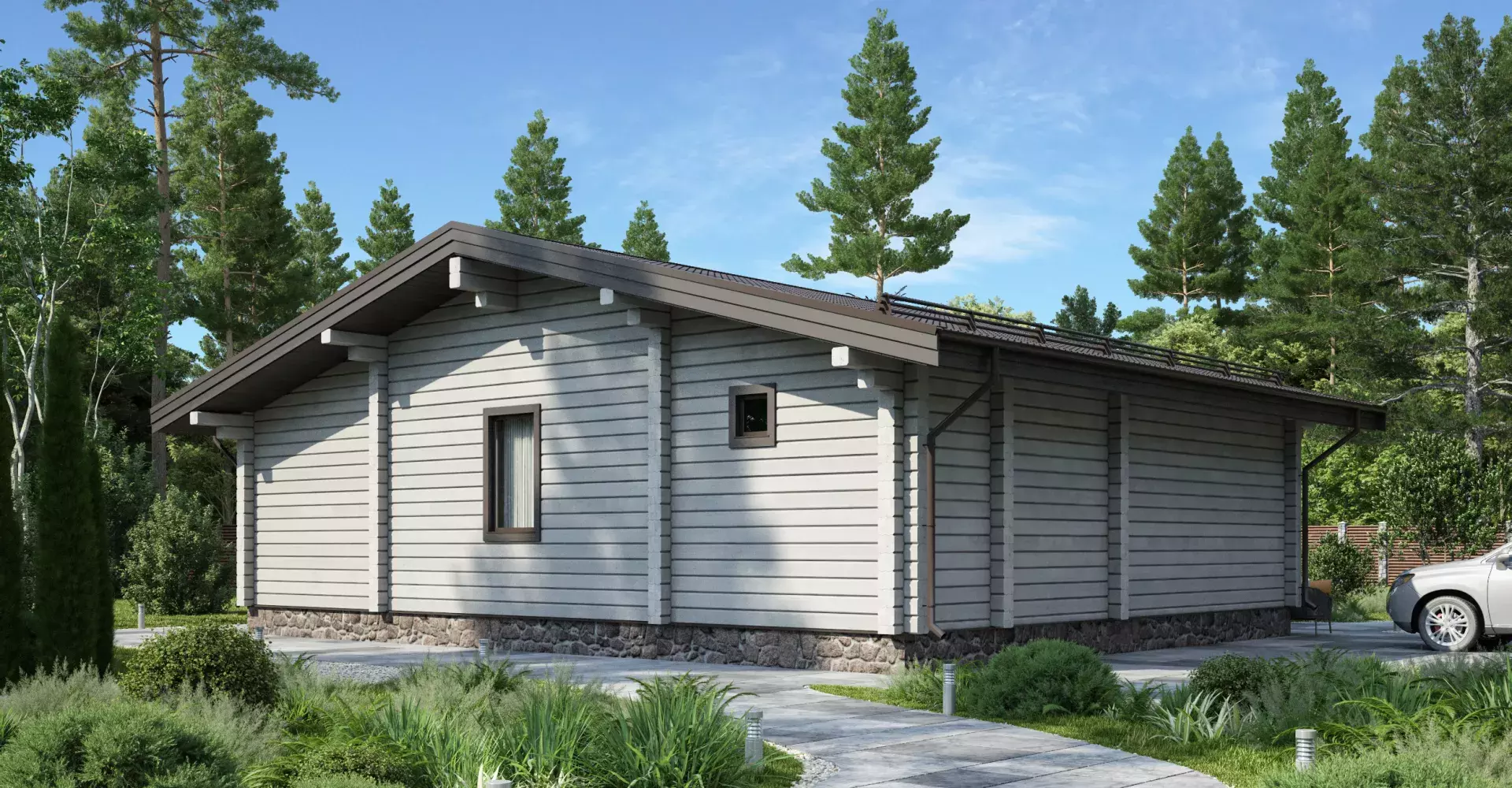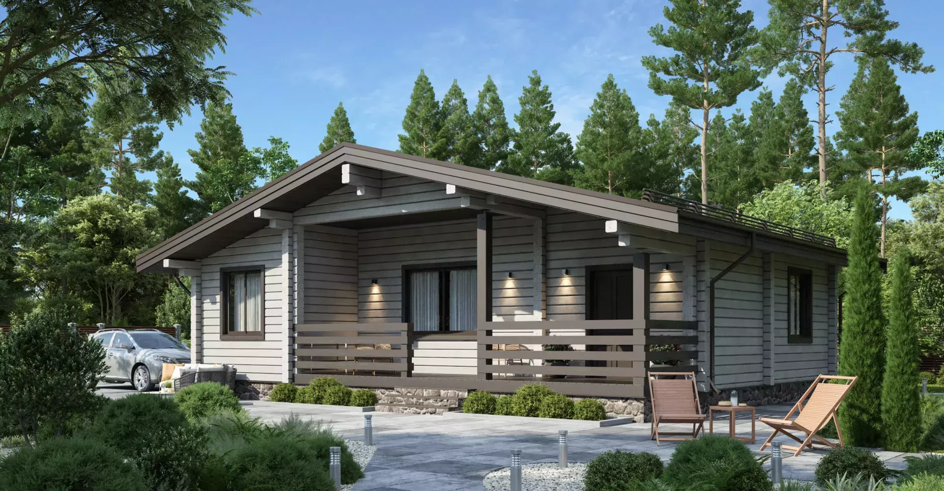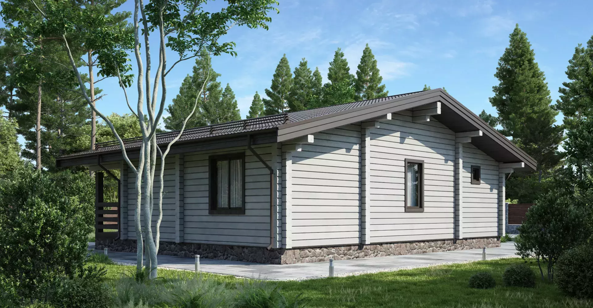 Проект одноэтажного деревянного дома из клееного бруса с террасой. Внутри дом начинается с просторной кухни-гостиной, по обе стороны которой имеются две спальни. Пригоден как для постоянного проживания небольшой семьи, так и для сезонного применения (дом выходного дня).
