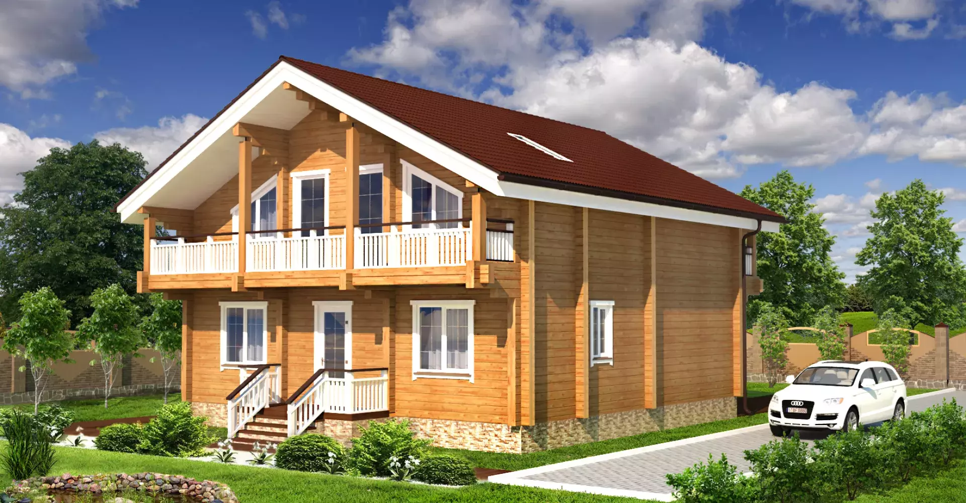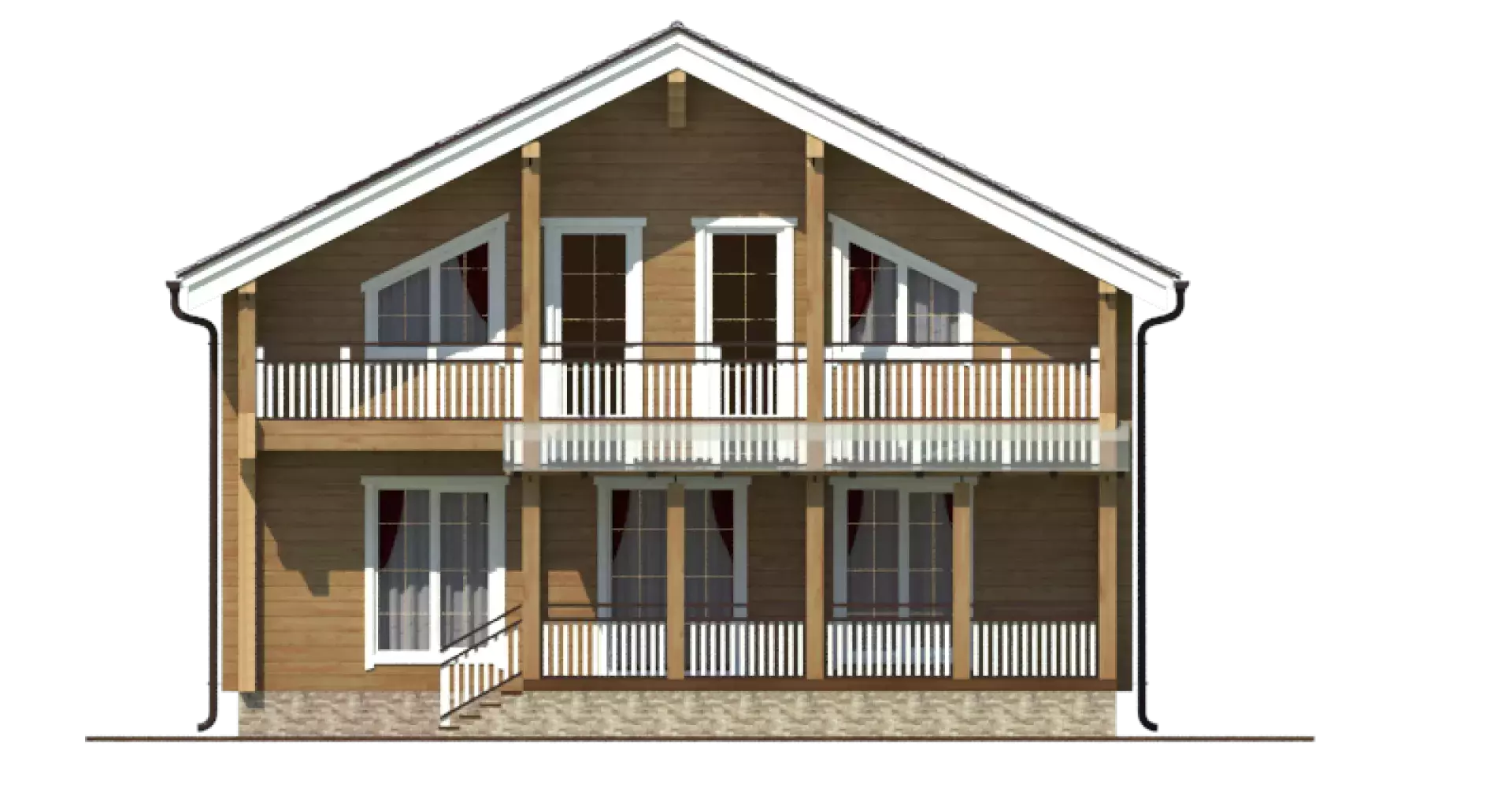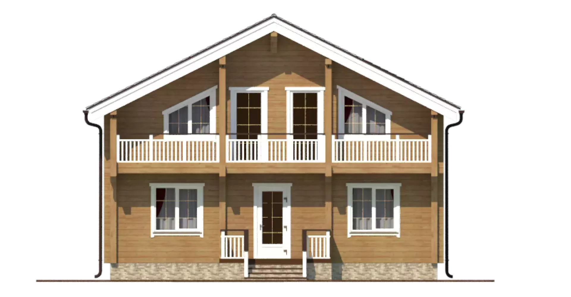На втором этаже разместились три спальни, одна из которых, родительская, имеет гардеробную комнату. Из каждой комнаты есть выход на балкон, занимающий всю длину фасада.