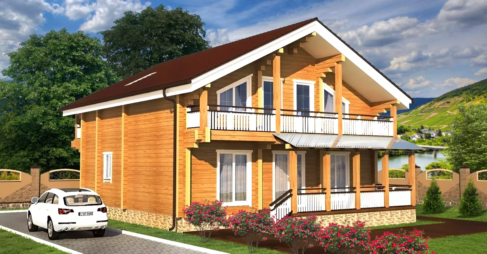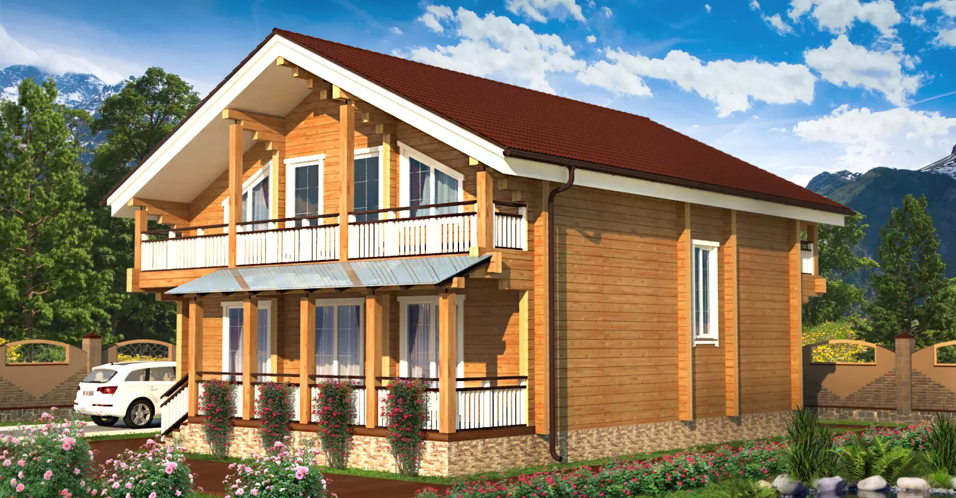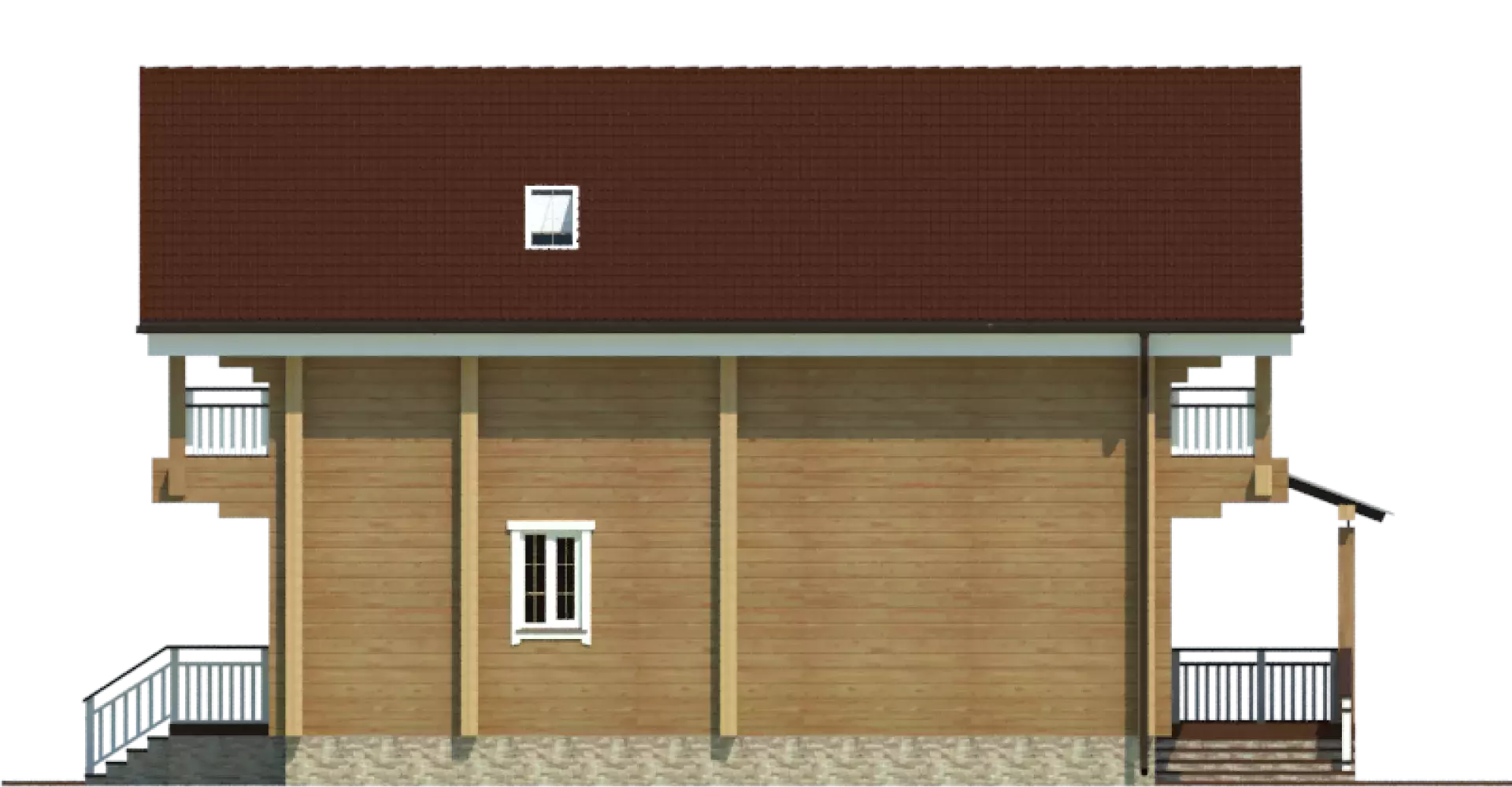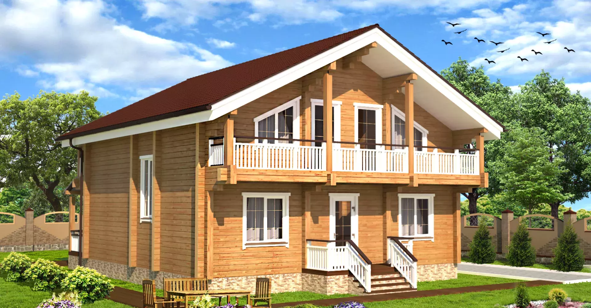 На втором этаже разместились три спальни, одна из которых, родительская, имеет гардеробную комнату. Из каждой комнаты есть выход на балкон, занимающий всю длину фасада.