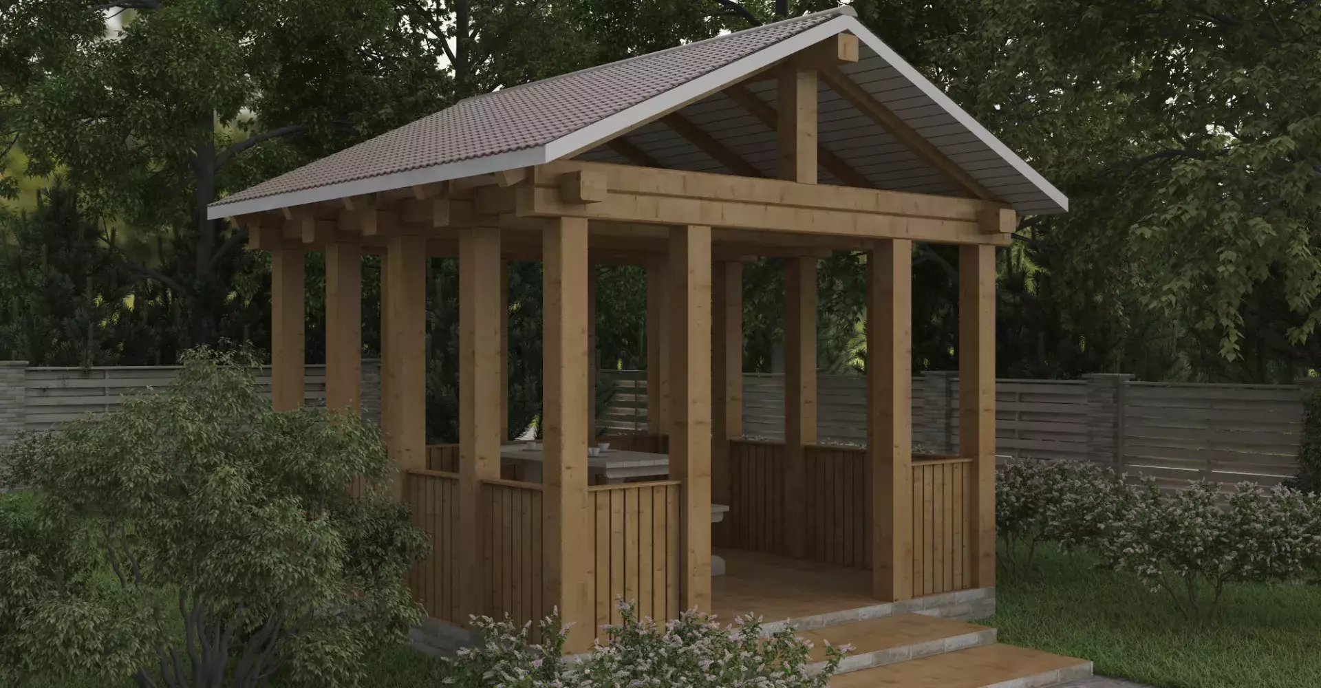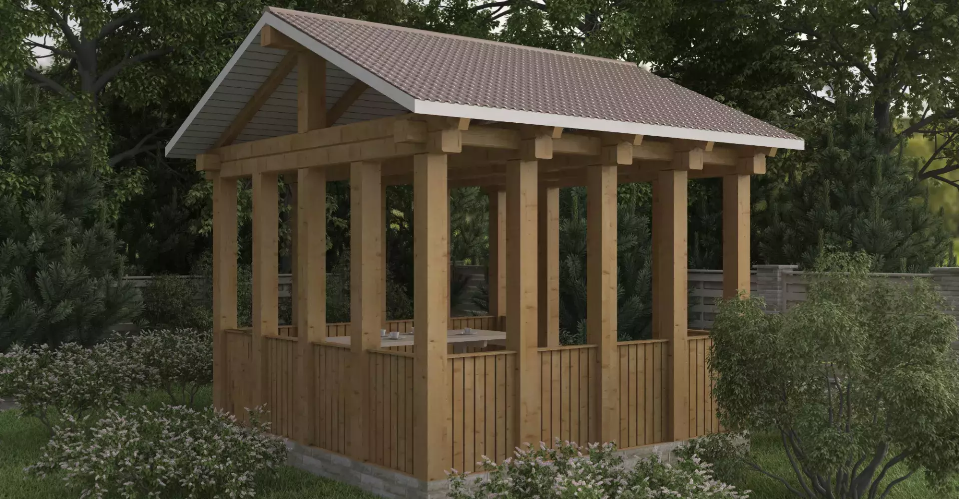Компактная беседка классического дизайна подойдет для отдыха в любую погоду и в любое время года.