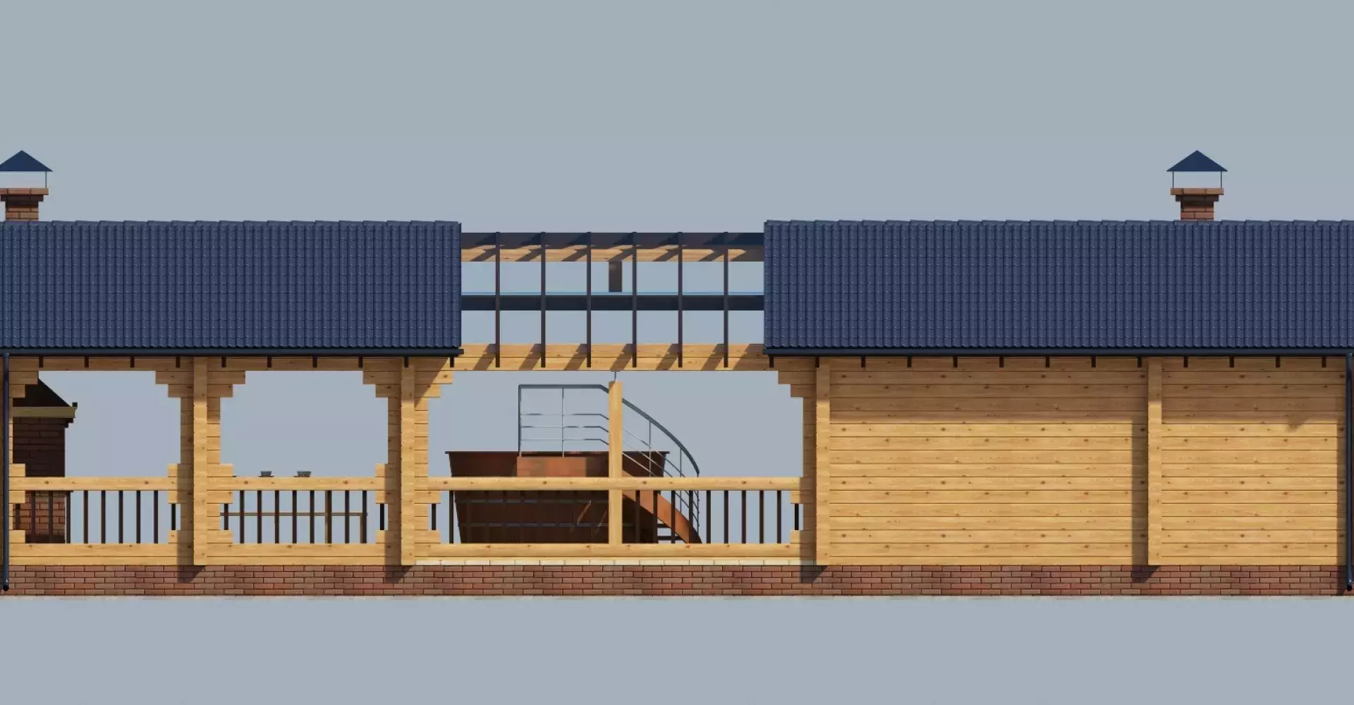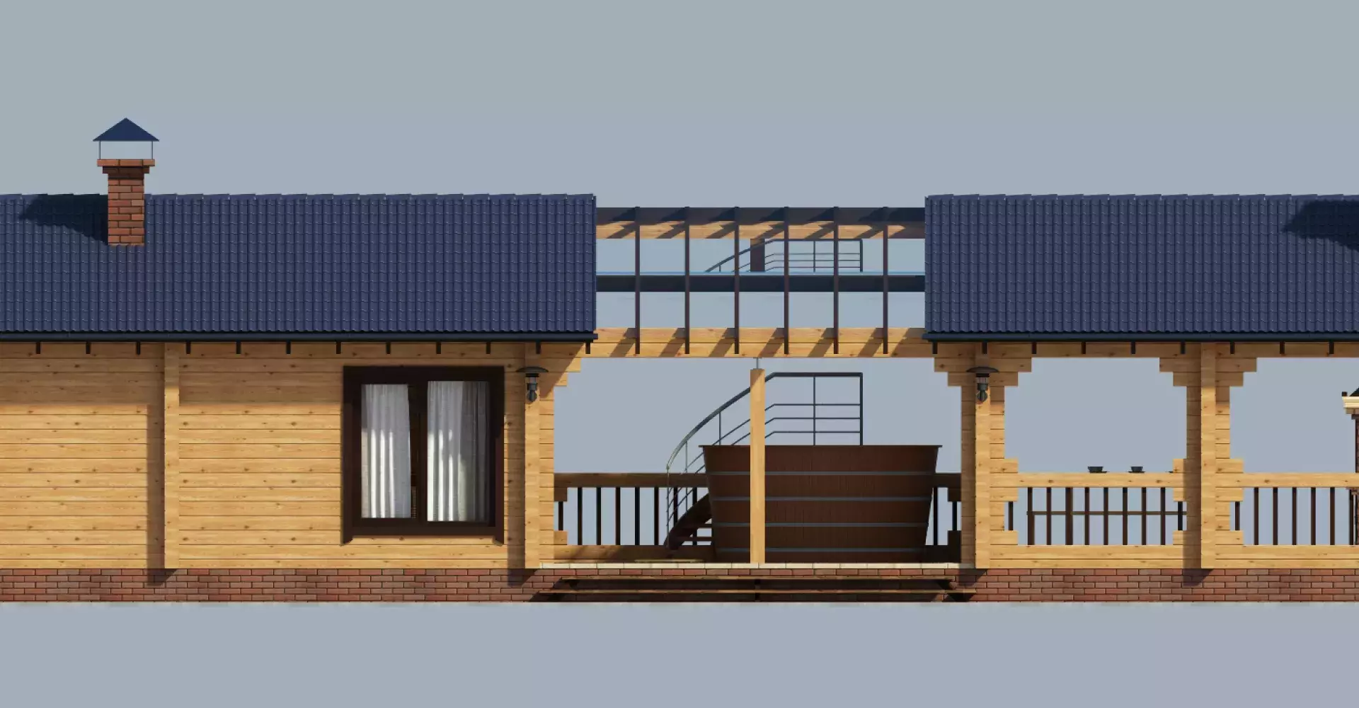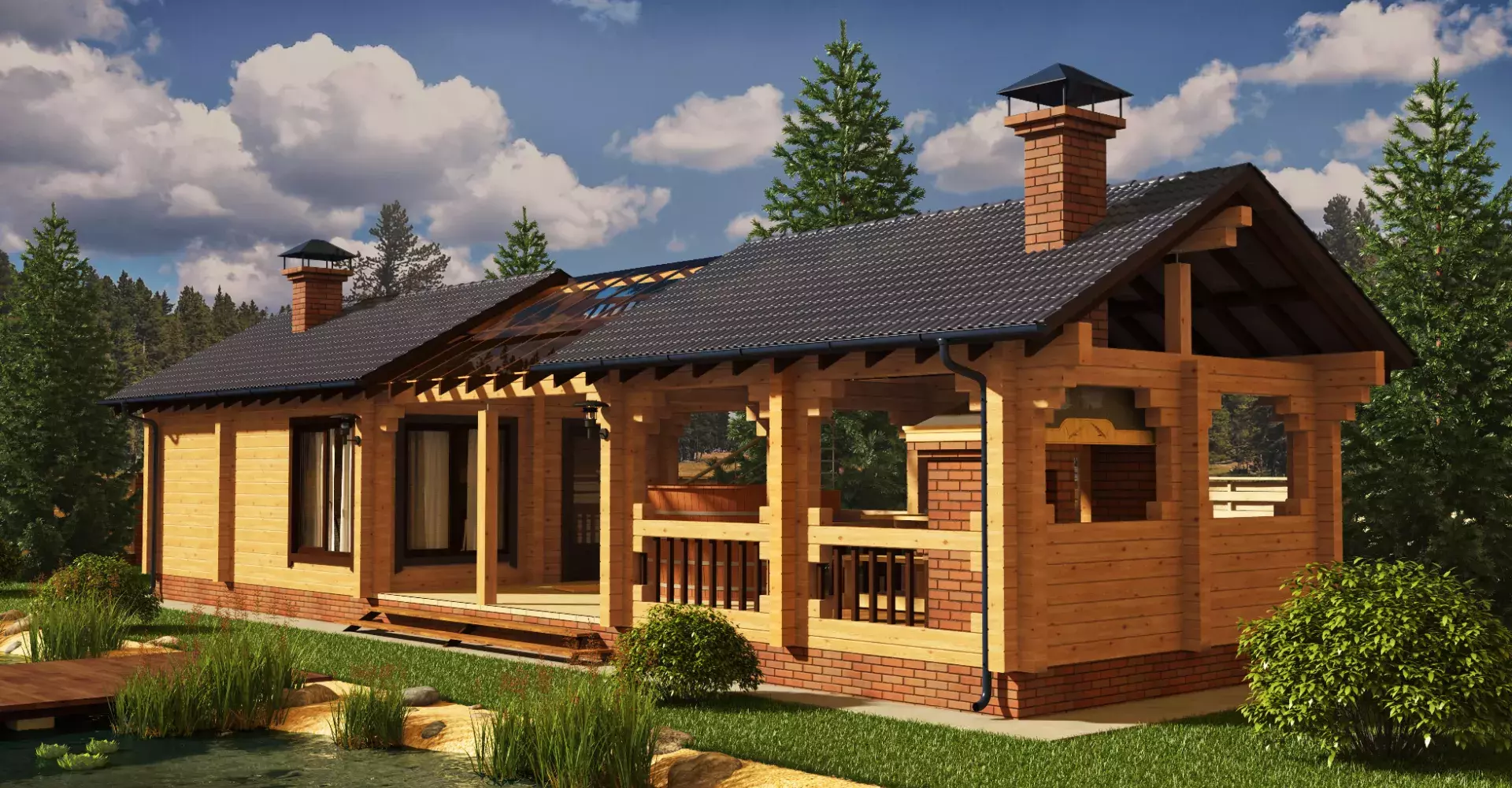Прямоугольная в плане баня из клееного бруса с просторной комнатой отдыха. Под одной крышей с основным объемом бани располагаются зона купания и вместительная терраса с летней кухней.