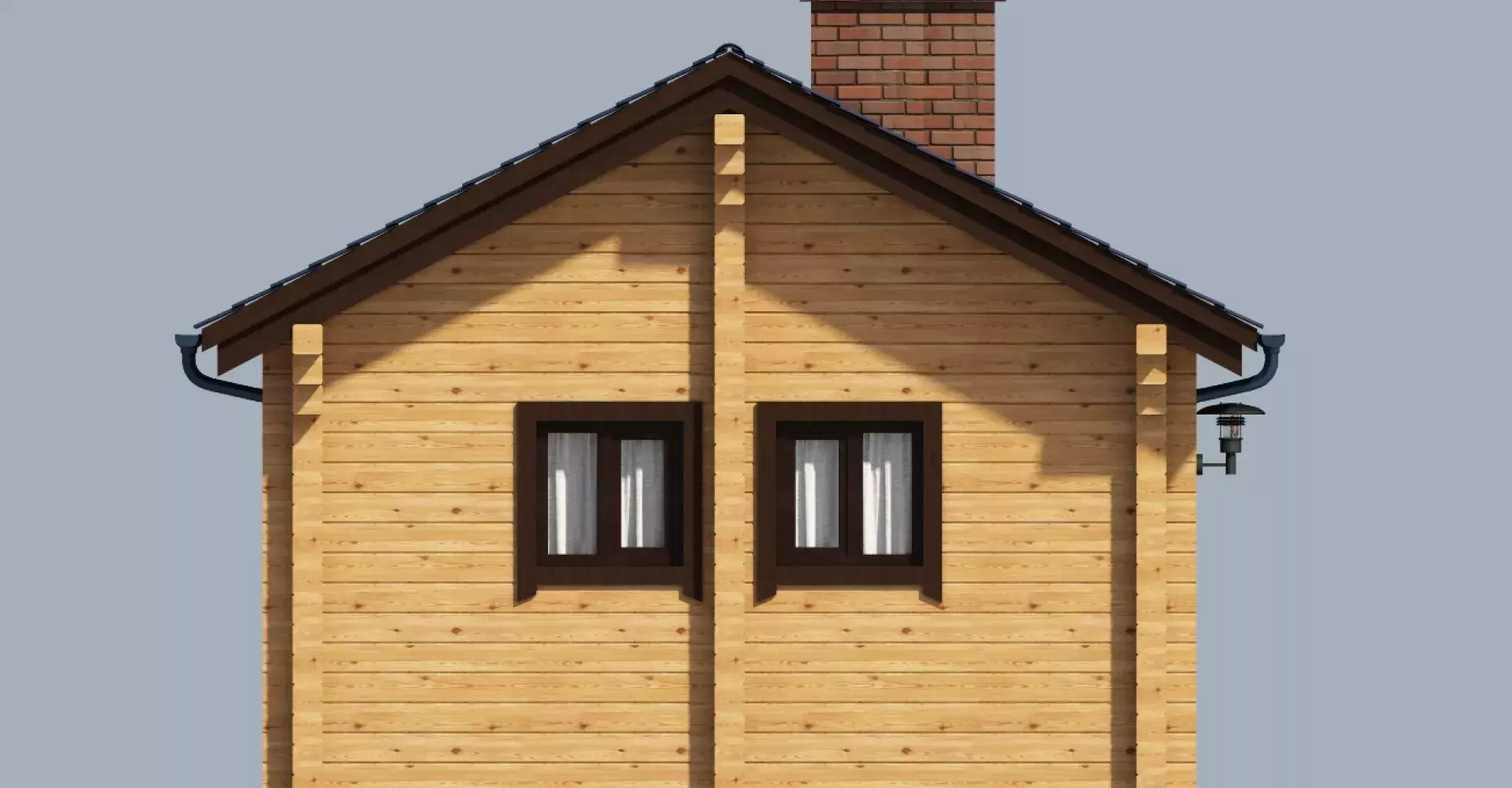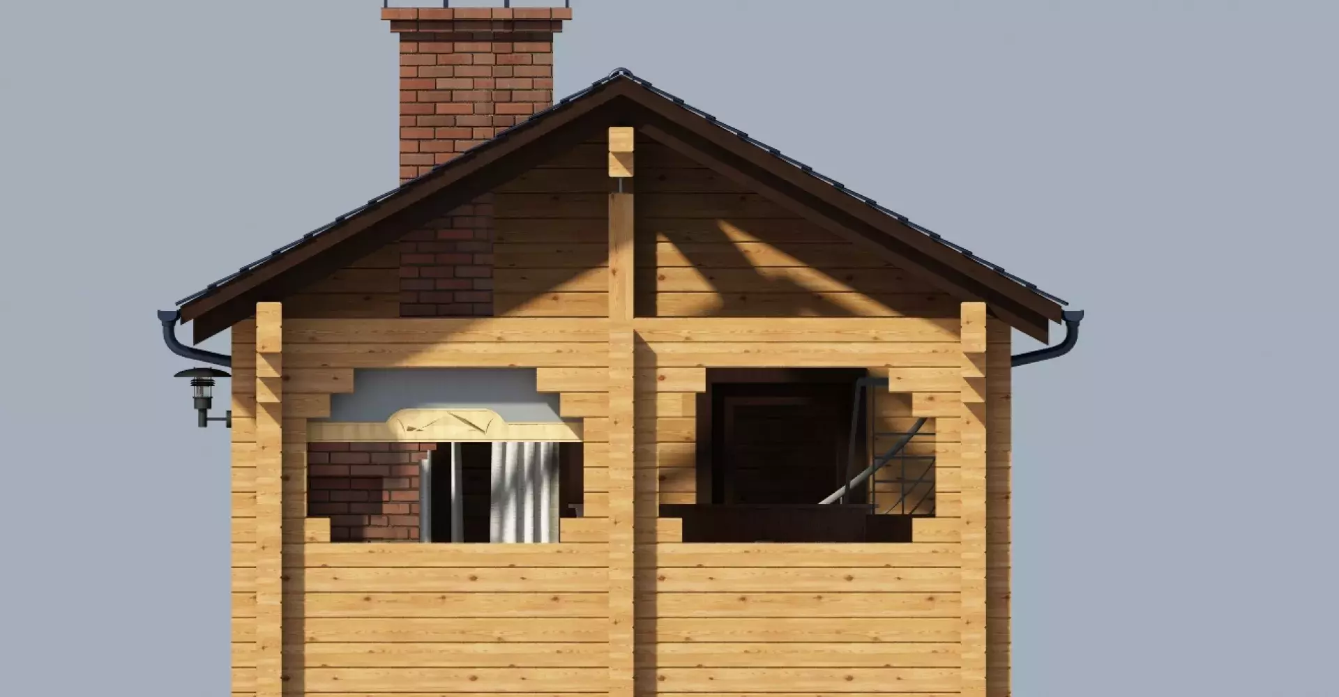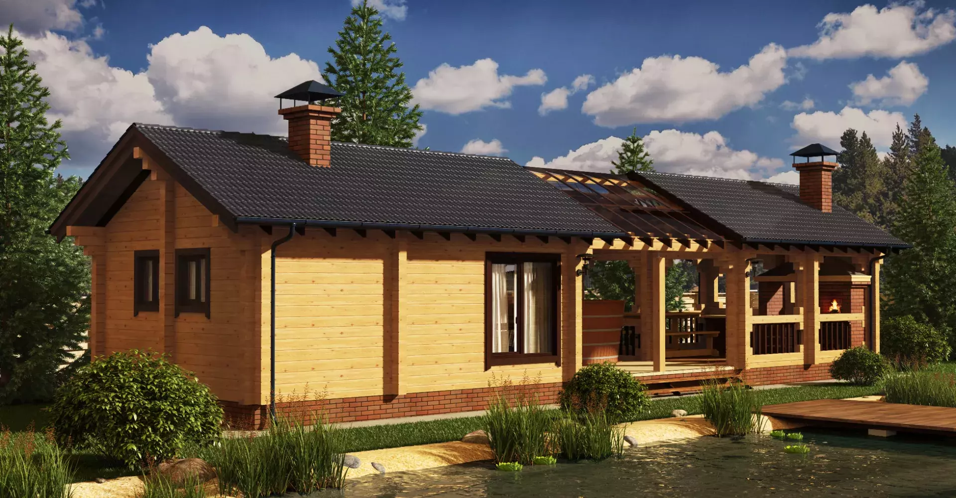 Прямоугольная в плане баня из клееного бруса с просторной комнатой отдыха. Под одной крышей с основным объемом бани располагаются зона купания и вместительная терраса с летней кухней.