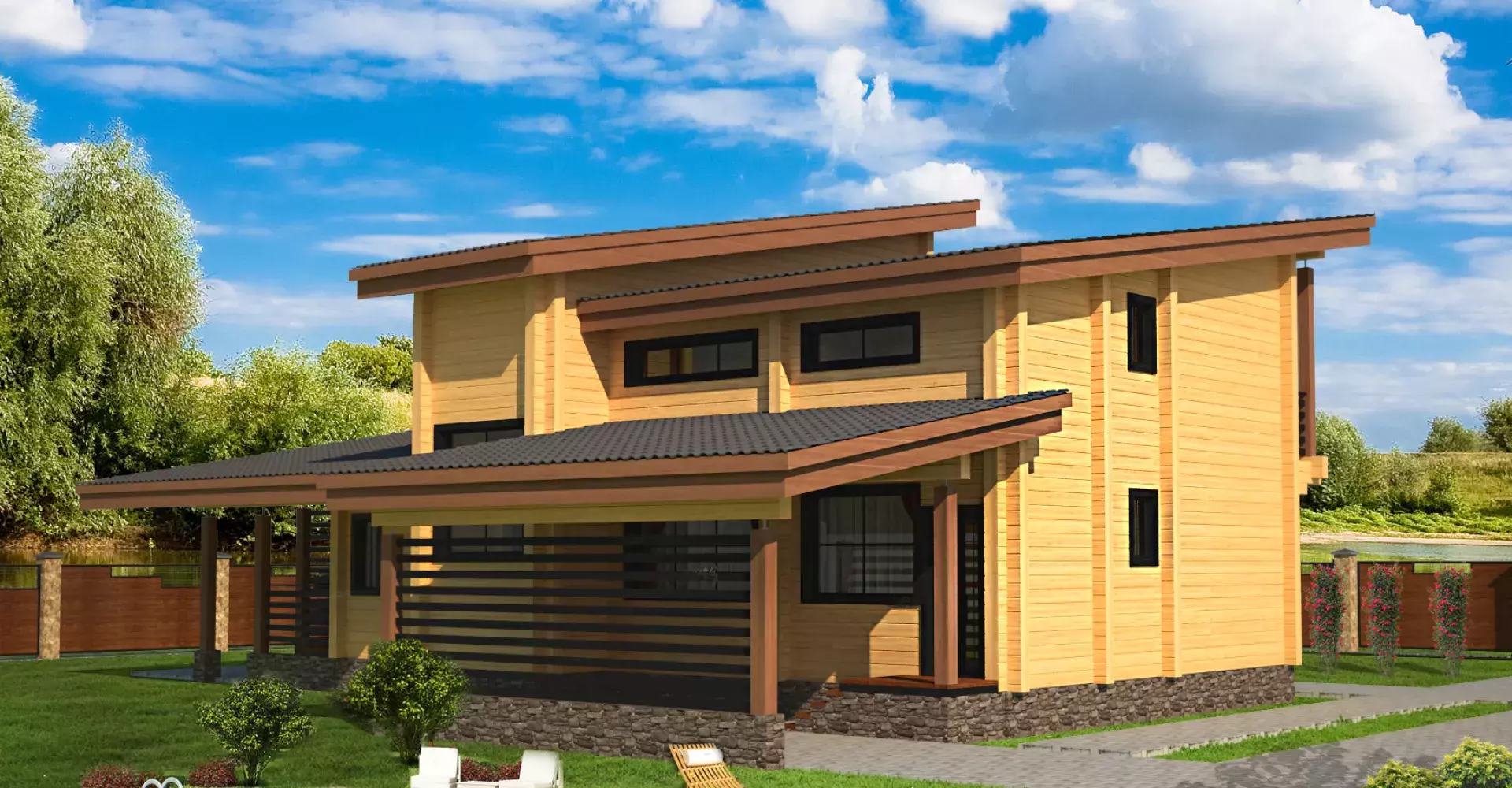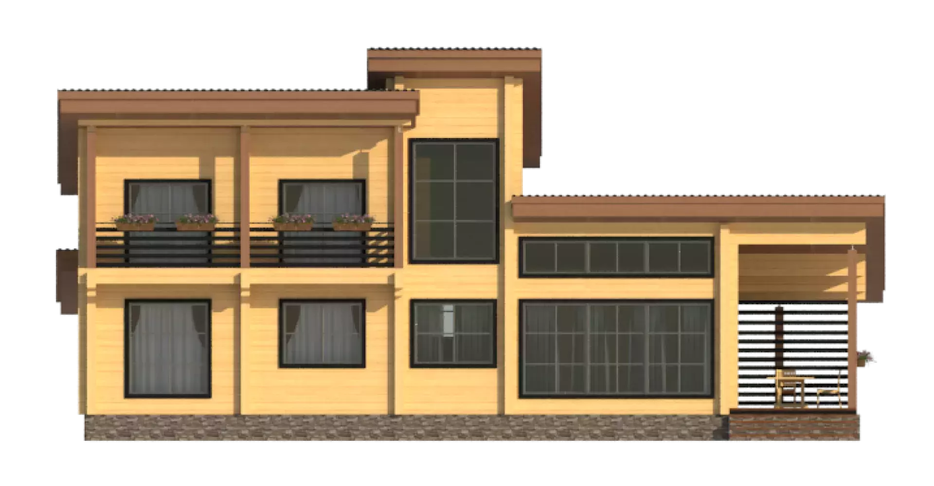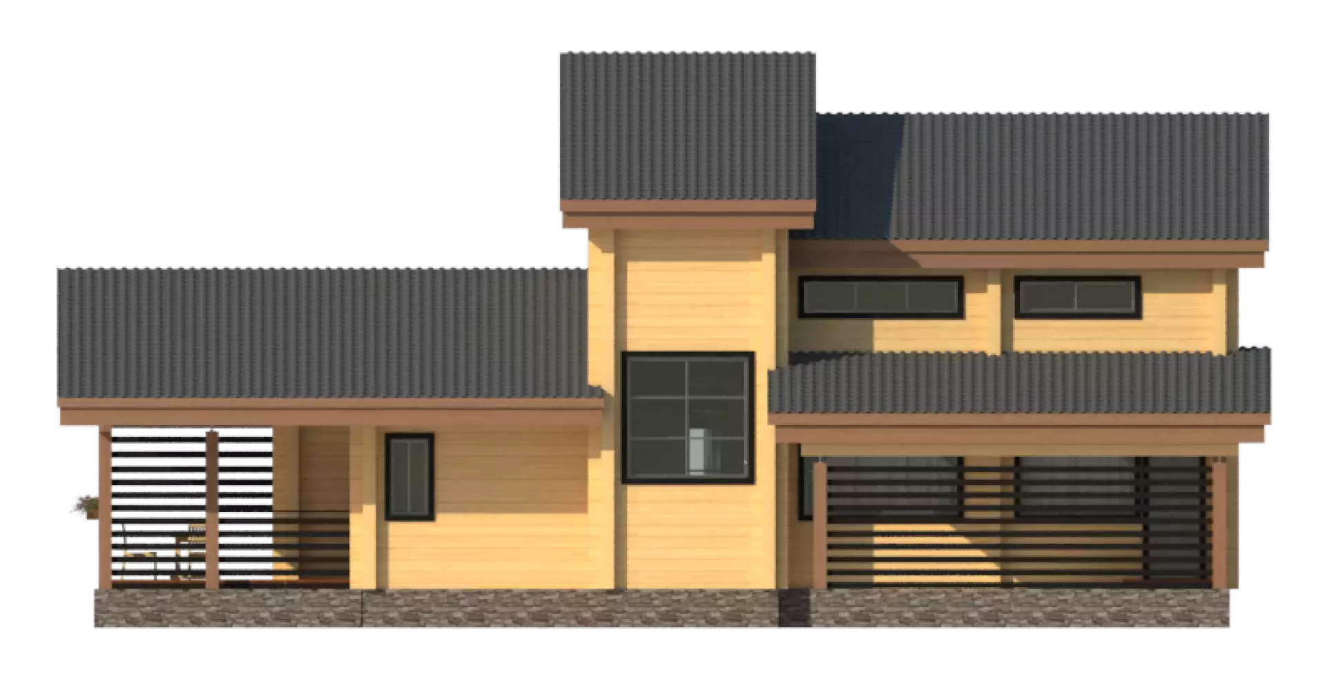 Двухэтажный дом из клееного бруса для постоянного проживания. Выполнен в современном стиле, где преобладают строгость линий, геометричность формы дома и элементов фасада.
