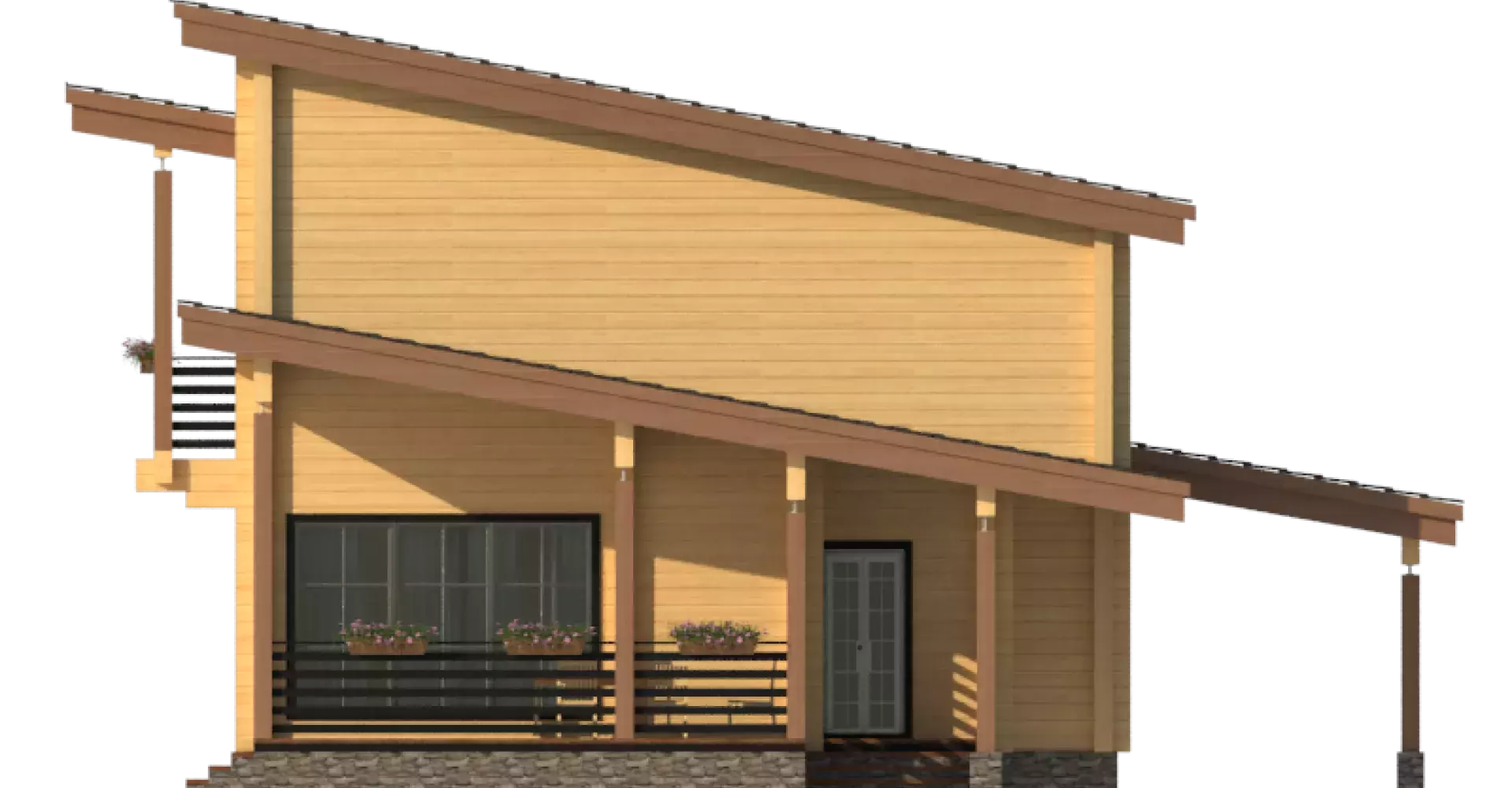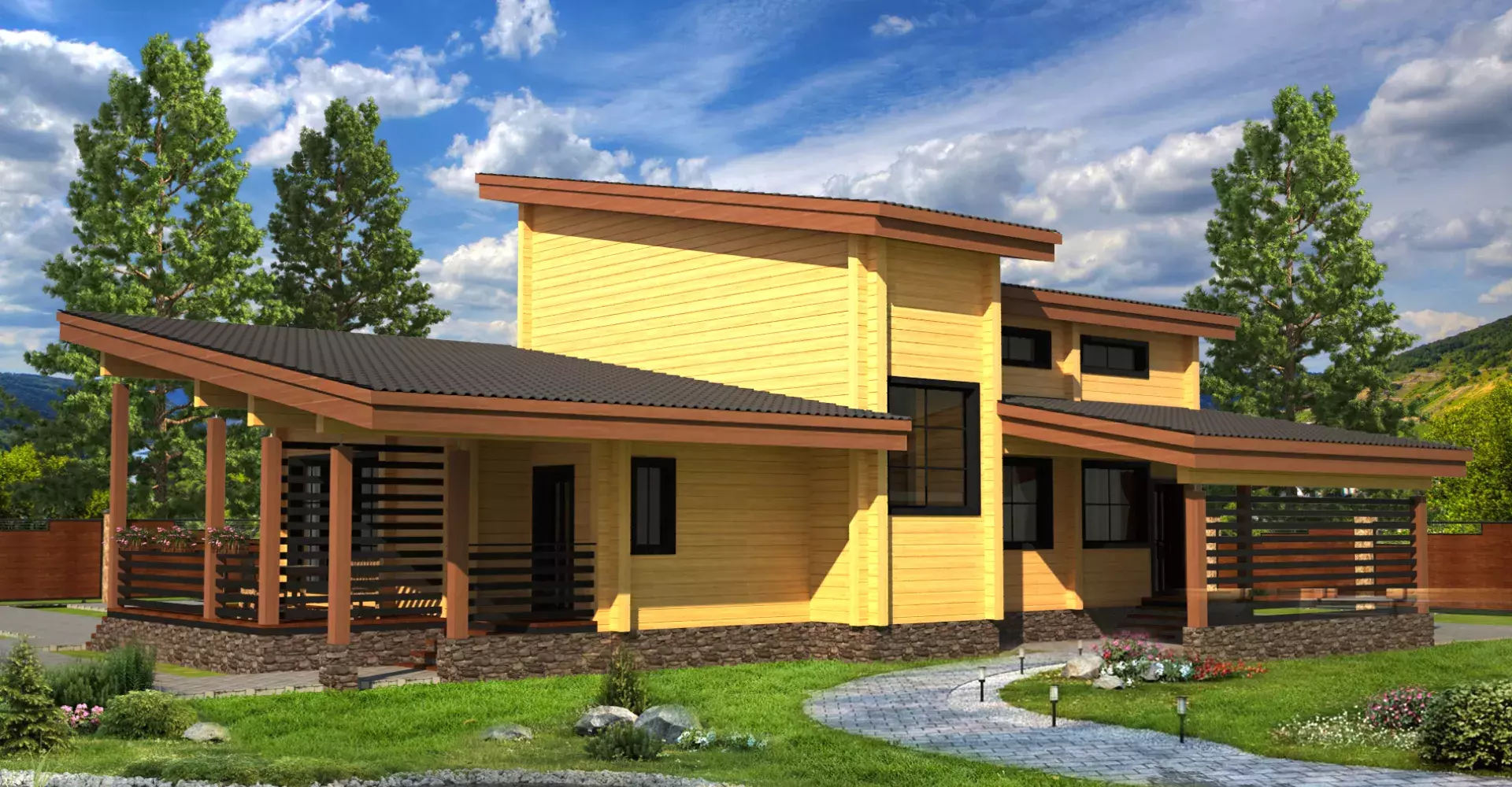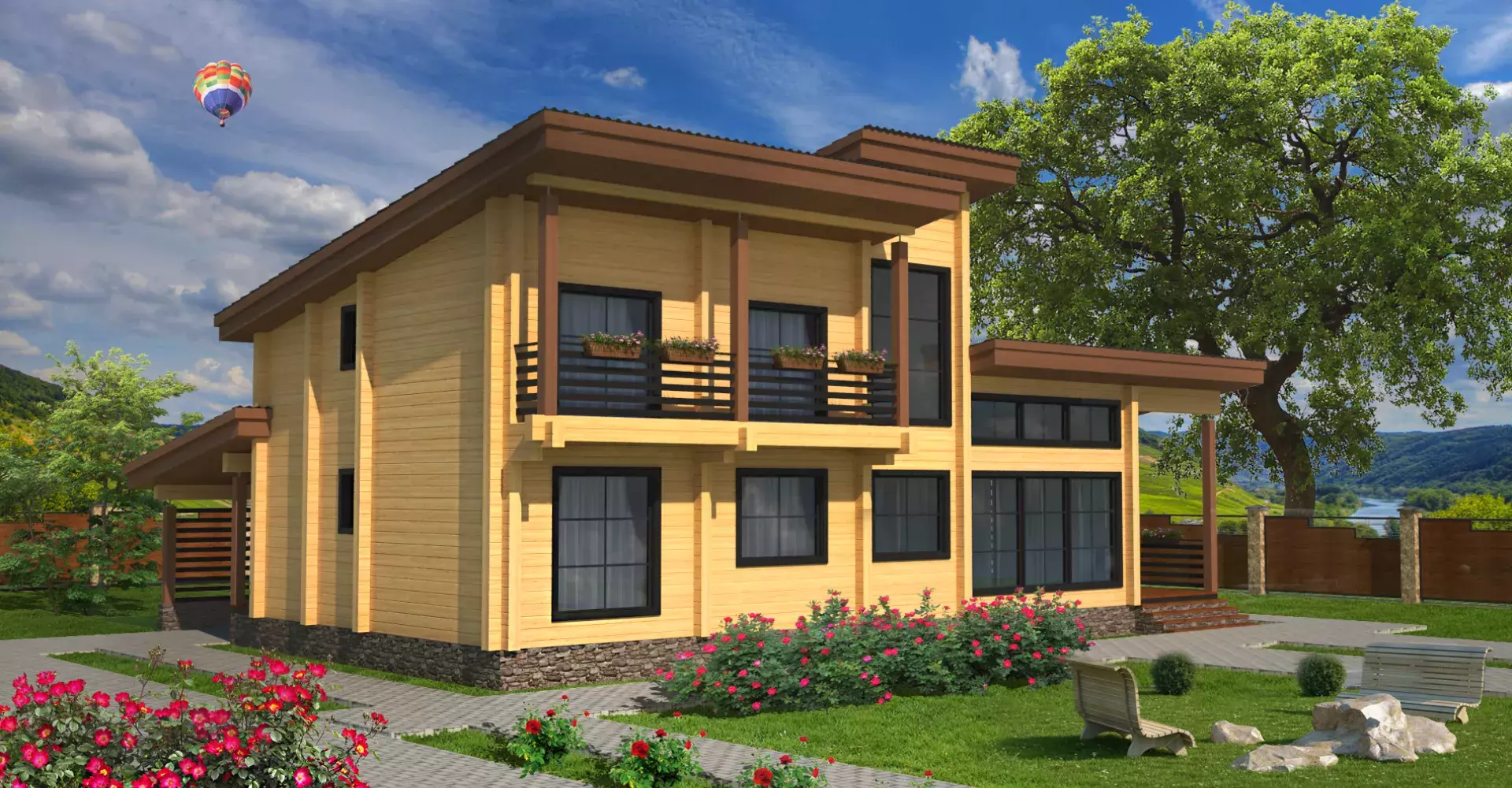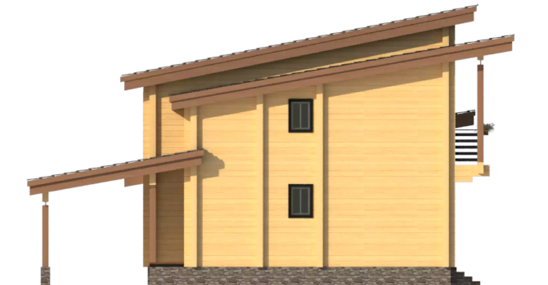 Двухэтажный дом из клееного бруса для постоянного проживания. Выполнен в современном стиле, где преобладают строгость линий, геометричность формы дома и элементов фасада.