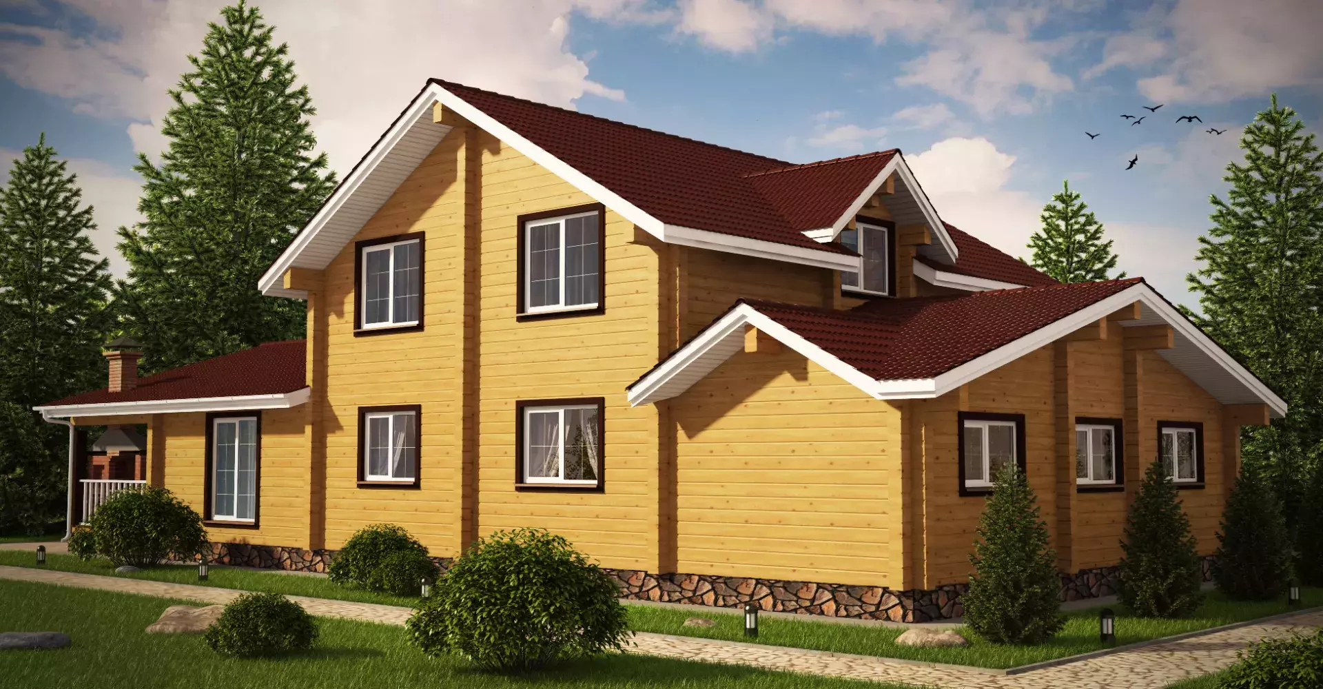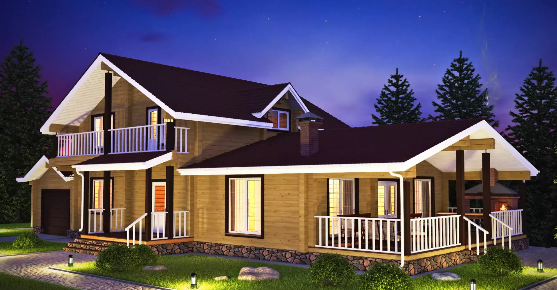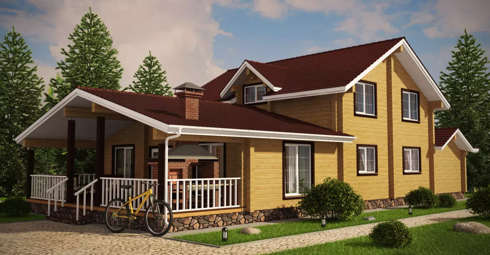 Просторный двухэтажный дом из клееного бруса с террасой и гаражом. Особенностью проекта являются 4 спальни, большая гостиная, гараж и протяженная крытая терраса с летней кухней.