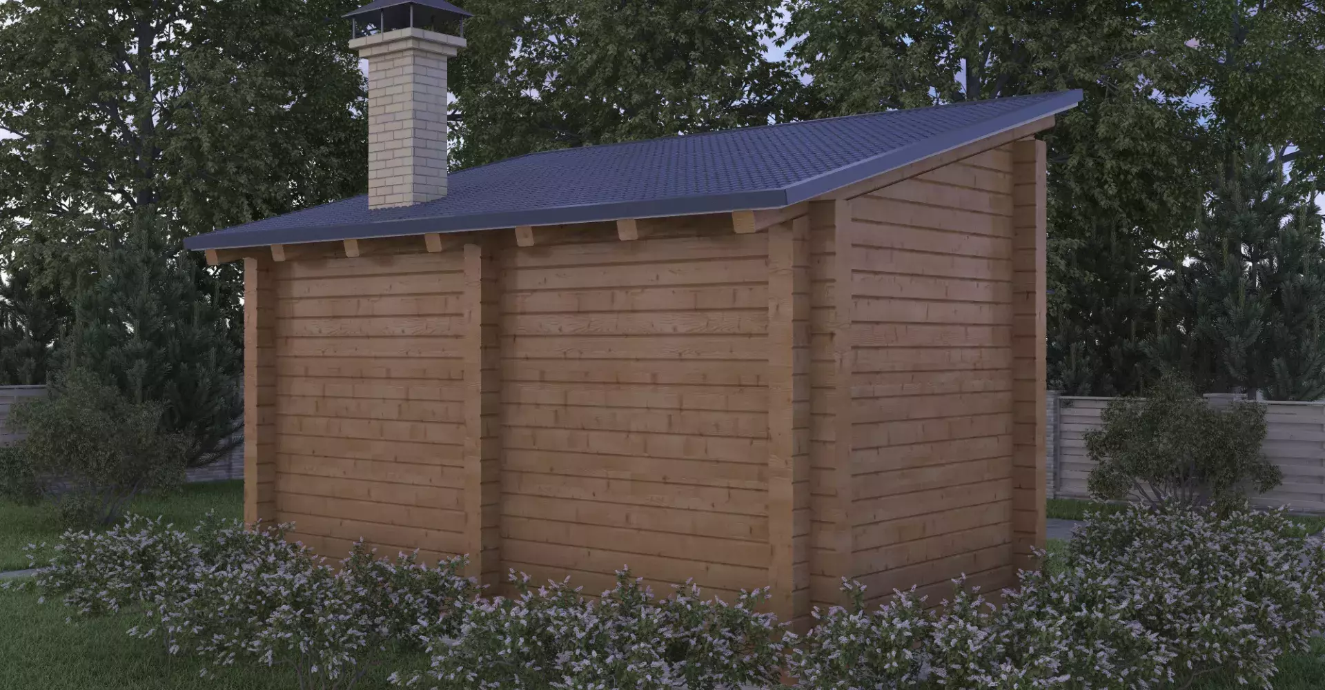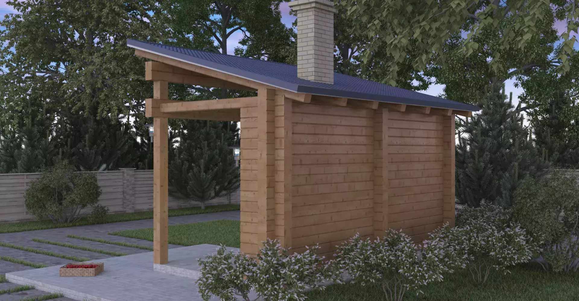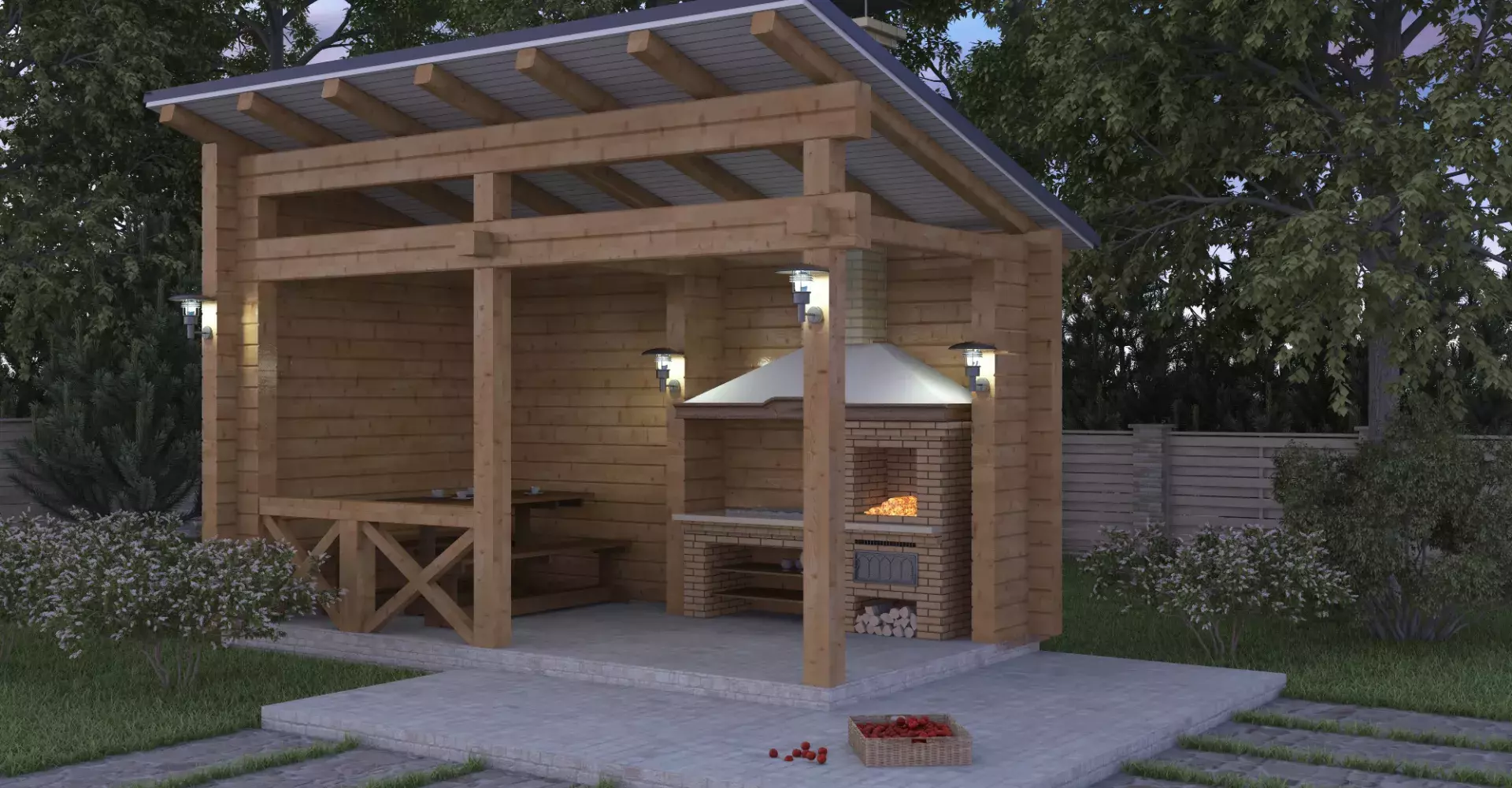 Простая и функциональная летняя кухня найдет своё место на любом участке. При необходимости особенность данного проекта – две сплошные стены, образующие угол, поможет вам отгородиться от соседей или скрыть неживописный вид.